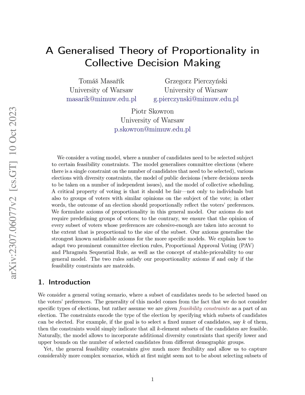 We consider a voting model, where a number of candidates need to be selected subject to certain feasibility constraints. The model generalises committee elections (where there is a single constraint on the number of candidates that need to be selected), various elections with diversity constraints, the model of public decisions (where decisions needs to be taken on a number of independent issues), and the model of collective scheduling. A critical property of voting is that it should be fair -- not only to individuals but also to groups of voters with similar opinions on the subject of the vote; in other words, the outcome of an election should proportionally reflect the voters' preferences. We formulate axioms of proportionality in this general model. Our axioms do not require predefining groups of voters; to the contrary, we ensure that the opinion of every subset of voters whose preferences are cohesive-enough are taken into account to the extent that is proportional to the size of the subset. Our axioms generalise the strongest known satisfiable axioms for the more specific models. We explain how to adapt two prominent committee election rules, Proportional Approval Voting (PAV) and Phragm\'{e}n Sequential Rule, as well as the concept of stable-priceability to our general model. The two rules satisfy our proportionality axioms if and only if the feasibility constraints are matroids.