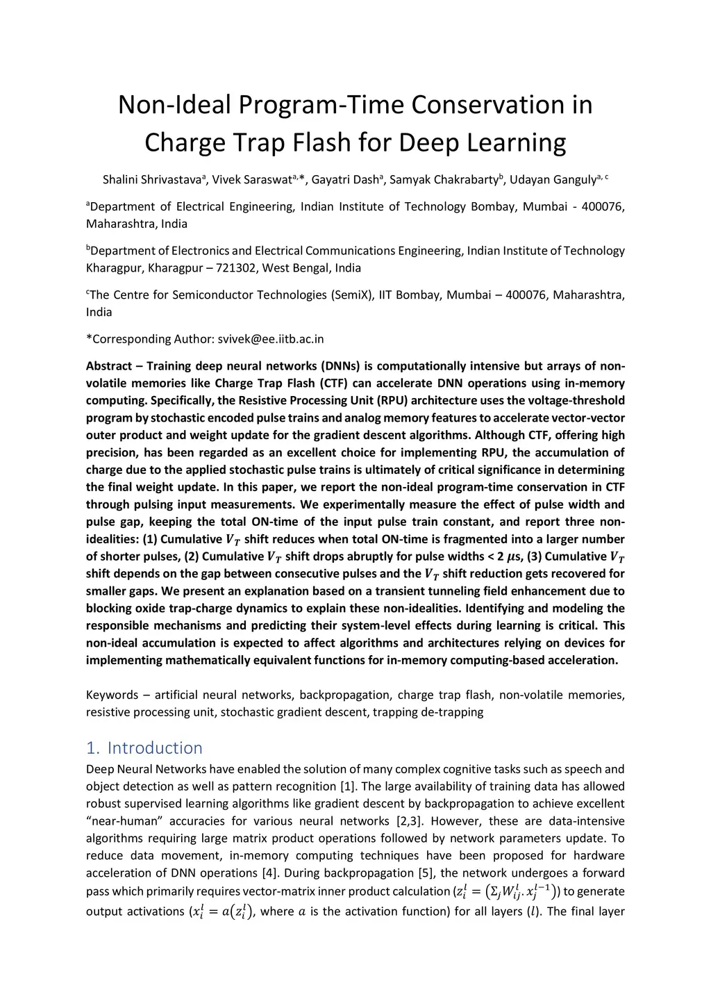 Training deep neural networks (DNNs) is computationally intensive but arrays of non-volatile memories like Charge Trap Flash (CTF) can accelerate DNN operations using in-memory computing. Specifically, the Resistive Processing Unit (RPU) architecture uses the voltage-threshold program by stochastic encoded pulse trains and analog memory features to accelerate vector-vector outer product and weight update for the gradient descent algorithms. Although CTF, offering high precision, has been regarded as an excellent choice for implementing RPU, the accumulation of charge due to the applied stochastic pulse trains is ultimately of critical significance in determining the final weight update. In this paper, we report the non-ideal program-time conservation in CTF through pulsing input measurements. We experimentally measure the effect of pulse width and pulse gap, keeping the total ON-time of the input pulse train constant, and report three non-idealities: (1) Cumulative V_T shift reduces when total ON-time is fragmented into a larger number of shorter pulses, (2) Cumulative V_T shift drops abruptly for pulse widths < 2 {\mu}s, (3) Cumulative V_T shift depends on the gap between consecutive pulses and the V_T shift reduction gets recovered for smaller gaps. We present an explanation based on a transient tunneling field enhancement due to blocking oxide trap-charge dynamics to explain these non-idealities. Identifying and modeling the responsible mechanisms and predicting their system-level effects during learning is critical. This non-ideal accumulation is expected to affect algorithms and architectures relying on devices for implementing mathematically equivalent functions for in-memory computing-based acceleration.
