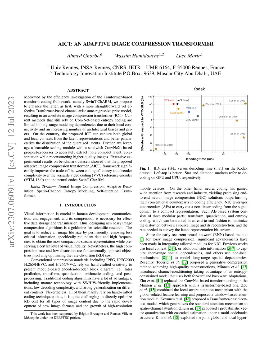 Motivated by the efficiency investigation of the Tranformer-based transform coding framework, namely SwinT-ChARM, we propose to enhance the latter, as first, with a more straightforward yet effective Tranformer-based channel-wise auto-regressive prior model, resulting in an absolute image compression transformer (ICT). Current methods that still rely on ConvNet-based entropy coding are limited in long-range modeling dependencies due to their local connectivity and an increasing number of architectural biases and priors. On the contrary, the proposed ICT can capture both global and local contexts from the latent representations and better parameterize the distribution of the quantized latents. Further, we leverage a learnable scaling module with a sandwich ConvNeXt-based pre/post-processor to accurately extract more compact latent representation while reconstructing higher-quality images. Extensive experimental results on benchmark datasets showed that the proposed adaptive image compression transformer (AICT) framework significantly improves the trade-off between coding efficiency and decoder complexity over the versatile video coding (VVC) reference encoder (VTM-18.0) and the neural codec SwinT-ChARM.