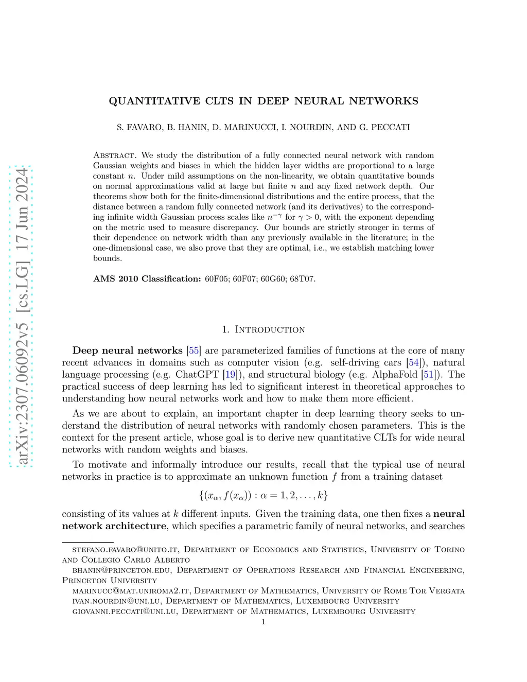 We study the distribution of a fully connected neural network with random Gaussian weights and biases in which the hidden layer widths are proportional to a large constant . Under mild assumptions on the non-linearity, we obtain quantitative bounds on normal approximations valid at large but finite and any fixed network depth. Our theorems show both for the finite-dimensional distributions and the entire process, that the distance between a random fully connected network (and its derivatives) to the corresponding infinite width Gaussian process scales like for , with the exponent depending on the metric used to measure discrepancy. Our bounds are strictly stronger in terms of their dependence on network width than any previously available in the literature; in the one-dimensional case, we also prove that they are optimal, i.e., we establish matching lower bounds.