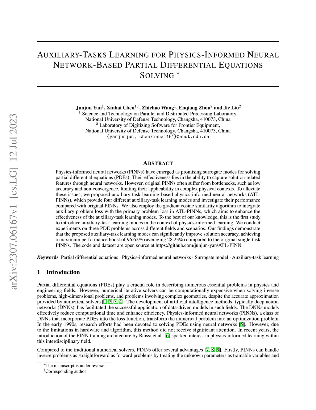 Physics-informed neural networks (PINNs) have emerged as promising surrogate modes for solving partial differential equations (PDEs). Their effectiveness lies in the ability to capture solution-related features through neural networks. However, original PINNs often suffer from bottlenecks, such as low accuracy and non-convergence, limiting their applicability in complex physical contexts. To alleviate these issues, we proposed auxiliary-task learning-based physics-informed neural networks (ATL-PINNs), which provide four different auxiliary-task learning modes and investigate their performance compared with original PINNs. We also employ the gradient cosine similarity algorithm to integrate auxiliary problem loss with the primary problem loss in ATL-PINNs, which aims to enhance the effectiveness of the auxiliary-task learning modes. To the best of our knowledge, this is the first study to introduce auxiliary-task learning modes in the context of physics-informed learning. We conduct experiments on three PDE problems across different fields and scenarios. Our findings demonstrate that the proposed auxiliary-task learning modes can significantly improve solution accuracy, achieving a maximum performance boost of 96.62% (averaging 28.23%) compared to the original single-task PINNs. The code and dataset are open source at https://github.com/junjun-yan/ATL-PINN.