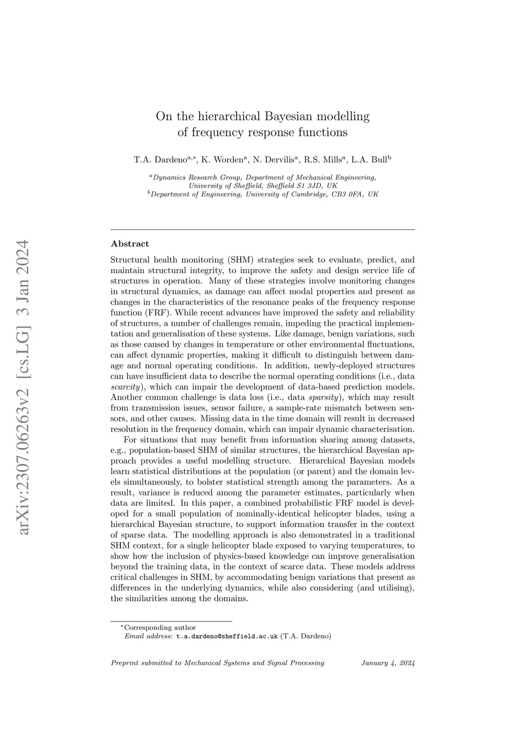 For situations that may benefit from information sharing among datasets, e.g., population-based SHM of similar structures, the hierarchical Bayesian approach provides a useful modelling structure. Hierarchical Bayesian models learn statistical distributions at the population (or parent) and the domain levels simultaneously, to bolster statistical strength among the parameters. As a result, variance is reduced among the parameter estimates, particularly when data are limited. In this paper, a combined probabilistic FRF model is developed for a small population of nominally-identical helicopter blades, using a hierarchical Bayesian structure, to support information transfer in the context of sparse data. The modelling approach is also demonstrated in a traditional SHM context, for a single helicopter blade exposed to varying temperatures, to show how the inclusion of physics-based knowledge can improve generalisation beyond the training data, in the context of scarce data. These models address critical challenges in SHM, by accommodating benign variations that present as differences in the underlying dynamics, while also considering (and utilising), the similarities among the domains.