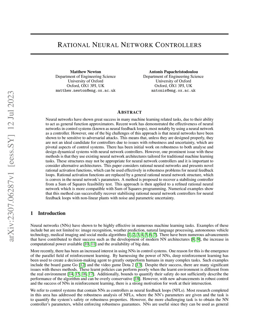 Neural networks have shown great success in many machine learning related tasks, due to their ability to act as general function approximators. Recent work has demonstrated the effectiveness of neural networks in control systems (known as neural feedback loops), most notably by using a neural network as a controller. However, one of the big challenges of this approach is that neural networks have been shown to be sensitive to adversarial attacks. This means that, unless they are designed properly, they are not an ideal candidate for controllers due to issues with robustness and uncertainty, which are pivotal aspects of control systems. There has been initial work on robustness to both analyse and design dynamical systems with neural network controllers. However, one prominent issue with these methods is that they use existing neural network architectures tailored for traditional machine learning tasks. These structures may not be appropriate for neural network controllers and it is important to consider alternative architectures. This paper considers rational neural networks and presents novel rational activation functions, which can be used effectively in robustness problems for neural feedback loops. Rational activation functions are replaced by a general rational neural network structure, which is convex in the neural network's parameters. A method is proposed to recover a stabilising controller from a Sum of Squares feasibility test. This approach is then applied to a refined rational neural network which is more compatible with Sum of Squares programming. Numerical examples show that this method can successfully recover stabilising rational neural network controllers for neural feedback loops with non-linear plants with noise and parametric uncertainty.