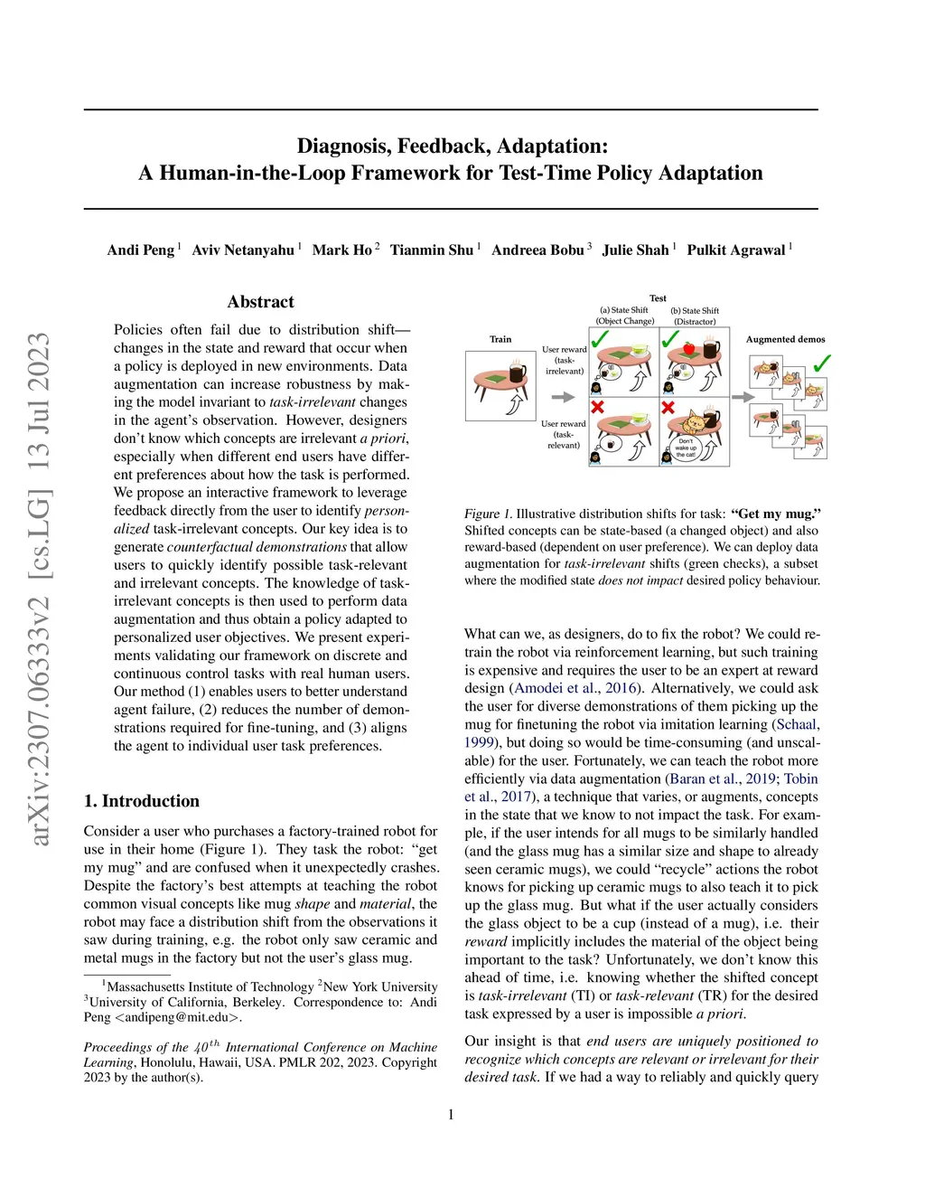 Policies often fail due to distribution shift -- changes in the state and reward that occur when a policy is deployed in new environments. Data augmentation can increase robustness by making the model invariant to task-irrelevant changes in the agent's observation. However, designers don't know which concepts are irrelevant a priori, especially when different end users have different preferences about how the task is performed. We propose an interactive framework to leverage feedback directly from the user to identify personalized task-irrelevant concepts. Our key idea is to generate counterfactual demonstrations that allow users to quickly identify possible task-relevant and irrelevant concepts. The knowledge of task-irrelevant concepts is then used to perform data augmentation and thus obtain a policy adapted to personalized user objectives. We present experiments validating our framework on discrete and continuous control tasks with real human users. Our method (1) enables users to better understand agent failure, (2) reduces the number of demonstrations required for fine-tuning, and (3) aligns the agent to individual user task preferences.