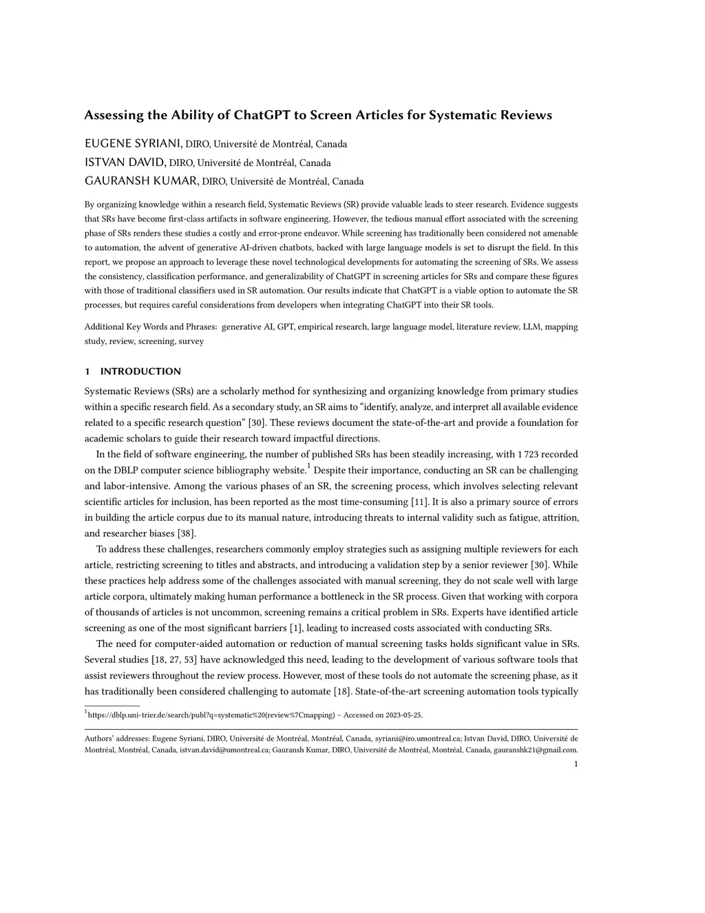 By organizing knowledge within a research field, Systematic Reviews (SR) provide valuable leads to steer research. Evidence suggests that SRs have become first-class artifacts in software engineering. However, the tedious manual effort associated with the screening phase of SRs renders these studies a costly and error-prone endeavor. While screening has traditionally been considered not amenable to automation, the advent of generative AI-driven chatbots, backed with large language models is set to disrupt the field. In this report, we propose an approach to leverage these novel technological developments for automating the screening of SRs. We assess the consistency, classification performance, and generalizability of ChatGPT in screening articles for SRs and compare these figures with those of traditional classifiers used in SR automation. Our results indicate that ChatGPT is a viable option to automate the SR processes, but requires careful considerations from developers when integrating ChatGPT into their SR tools.