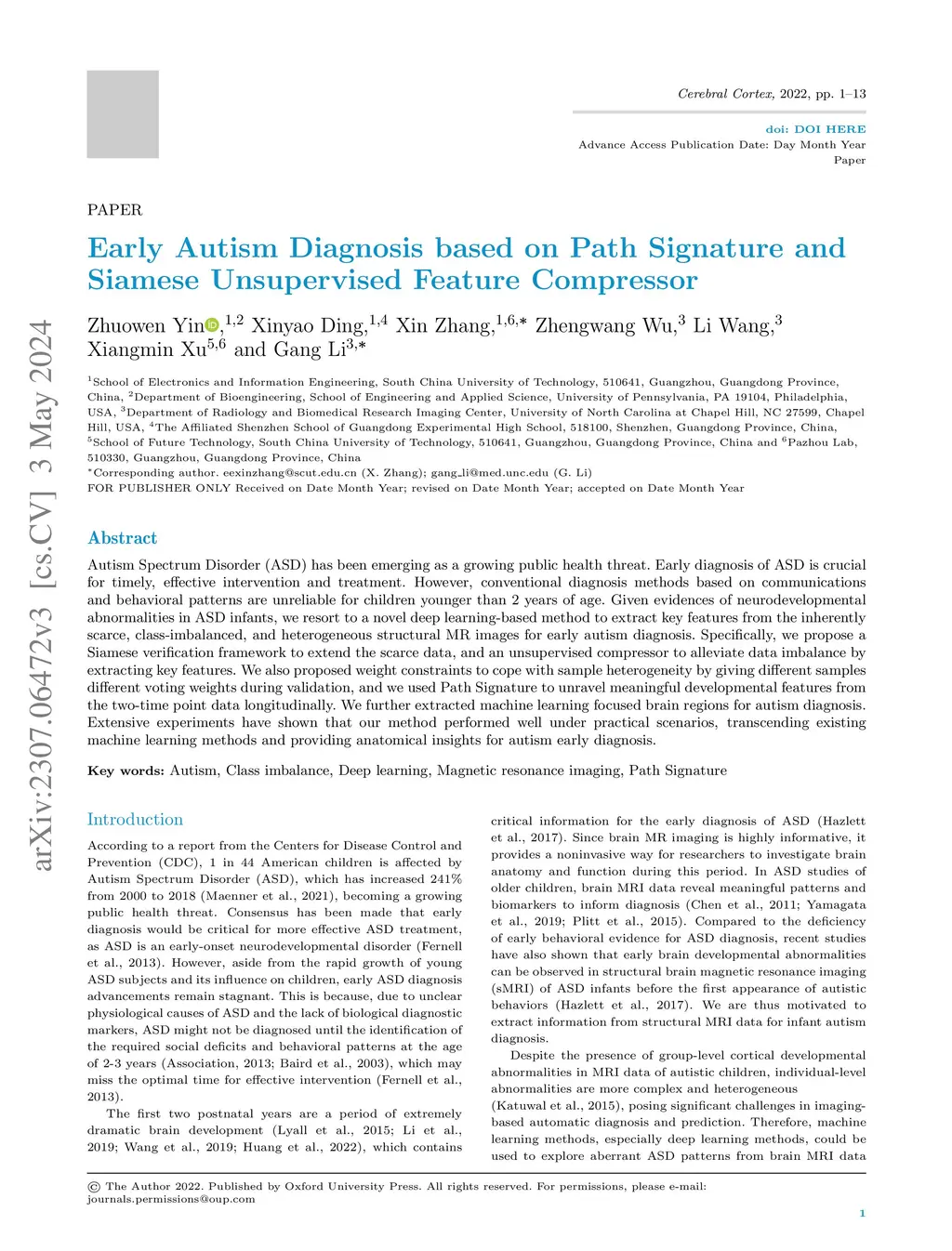 Early Autism Diagnosis based on Path Signature and Siamese Unsupervised