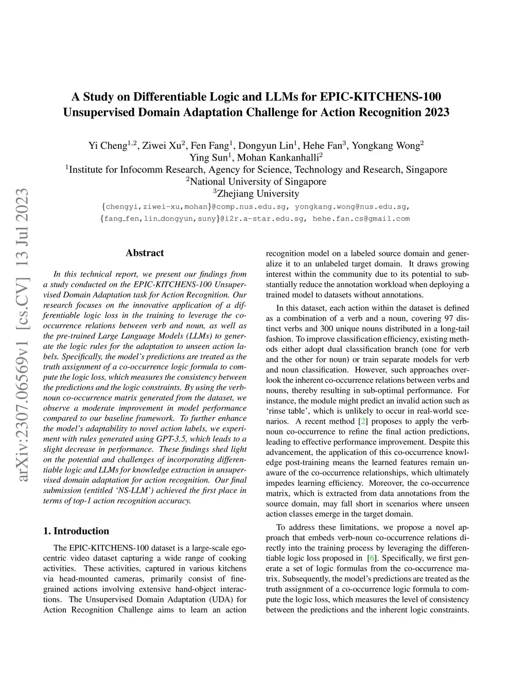 In this technical report, we present our findings from a study conducted on the EPIC-KITCHENS-100 Unsupervised Domain Adaptation task for Action Recognition. Our research focuses on the innovative application of a differentiable logic loss in the training to leverage the co-occurrence relations between verb and noun, as well as the pre-trained Large Language Models (LLMs) to generate the logic rules for the adaptation to unseen action labels. Specifically, the model's predictions are treated as the truth assignment of a co-occurrence logic formula to compute the logic loss, which measures the consistency between the predictions and the logic constraints. By using the verb-noun co-occurrence matrix generated from the dataset, we observe a moderate improvement in model performance compared to our baseline framework. To further enhance the model's adaptability to novel action labels, we experiment with rules generated using GPT-3.5, which leads to a slight decrease in performance. These findings shed light on the potential and challenges of incorporating differentiable logic and LLMs for knowledge extraction in unsupervised domain adaptation for action recognition. Our final submission (entitled `NS-LLM') achieved the first place in terms of top-1 action recognition accuracy.