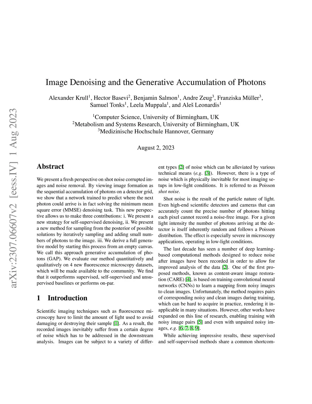 We present a fresh perspective on shot noise corrupted images and noise removal. By viewing image formation as the sequential accumulation of photons on a detector grid, we show that a network trained to predict where the next photon could arrive is in fact solving the minimum mean square error (MMSE) denoising task. This new perspective allows us to make three contributions: We present a new strategy for self-supervised denoising, We present a new method for sampling from the posterior of possible solutions by iteratively sampling and adding small numbers of photons to the image. We derive a full generative model by starting this process from an empty canvas. We call this approach generative accumulation of photons (GAP). We evaluate our method quantitatively and qualitatively on 4 new fluorescence microscopy datasets, which will be made available to the community. We find that it outperforms supervised, self-supervised and unsupervised baselines or performs on-par.