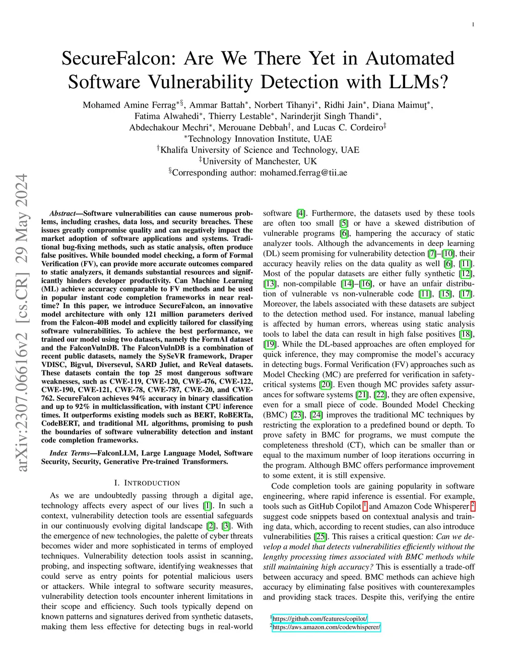 Software vulnerabilities can cause numerous problems, including crashes, data loss, and security breaches. These issues greatly compromise quality and can negatively impact the market adoption of software applications and systems. Traditional bug-fixing methods, such as static analysis, often produce false positives. While bounded model checking, a form of Formal Verification (FV), can provide more accurate outcomes compared to static analyzers, it demands substantial resources and significantly hinders developer productivity. Can Machine Learning (ML) achieve accuracy comparable to FV methods and be used in popular instant code completion frameworks in near real-time? In this paper, we introduce SecureFalcon, an innovative model architecture with only 121 million parameters derived from the Falcon-40B model and explicitly tailored for classifying software vulnerabilities. To achieve the best performance, we trained our model using two datasets, namely the FormAI dataset and the FalconVulnDB. The FalconVulnDB is a combination of recent public datasets, namely the SySeVR framework, Draper VDISC, Bigvul, Diversevul, SARD Juliet, and ReVeal datasets. These datasets contain the top 25 most dangerous software weaknesses, such as CWE-119, CWE-120, CWE-476, CWE-122, CWE-190, CWE-121, CWE-78, CWE-787, CWE-20, and CWE-762. SecureFalcon achieves 94% accuracy in binary classification and up to 92% in multiclassification, with instant CPU inference times. It outperforms existing models such as BERT, RoBERTa, CodeBERT, and traditional ML algorithms, promising to push the boundaries of software vulnerability detection and instant code completion frameworks.
