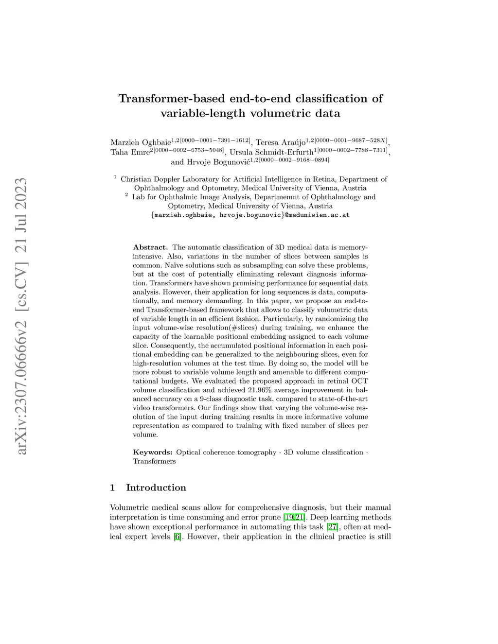 The automatic classification of 3D medical data is memory-intensive. Also, variations in the number of slices between samples is common. Na\"ive solutions such as subsampling can solve these problems, but at the cost of potentially eliminating relevant diagnosis information. Transformers have shown promising performance for sequential data analysis. However, their application for long sequences is data, computationally, and memory demanding. In this paper, we propose an end-to-end Transformer-based framework that allows to classify volumetric data of variable length in an efficient fashion. Particularly, by randomizing the input volume-wise resolution(#slices) during training, we enhance the capacity of the learnable positional embedding assigned to each volume slice. Consequently, the accumulated positional information in each positional embedding can be generalized to the neighbouring slices, even for high-resolution volumes at the test time. By doing so, the model will be more robust to variable volume length and amenable to different computational budgets. We evaluated the proposed approach in retinal OCT volume classification and achieved 21.96% average improvement in balanced accuracy on a 9-class diagnostic task, compared to state-of-the-art video transformers. Our findings show that varying the volume-wise resolution of the input during training results in more informative volume representation as compared to training with fixed number of slices per volume.