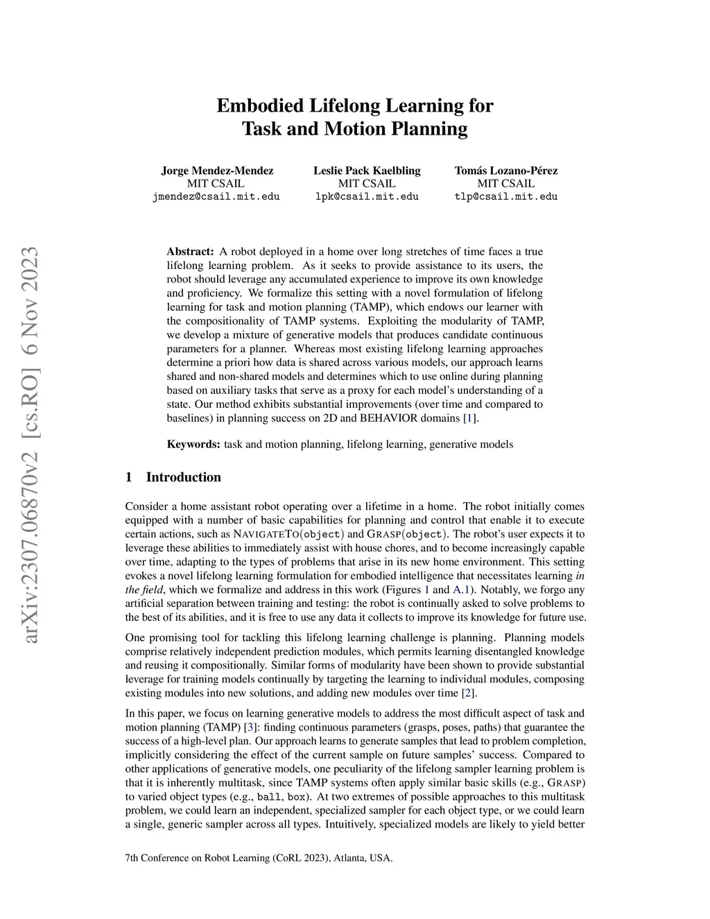 Embodied Lifelong Learning for Task and Motion Planning