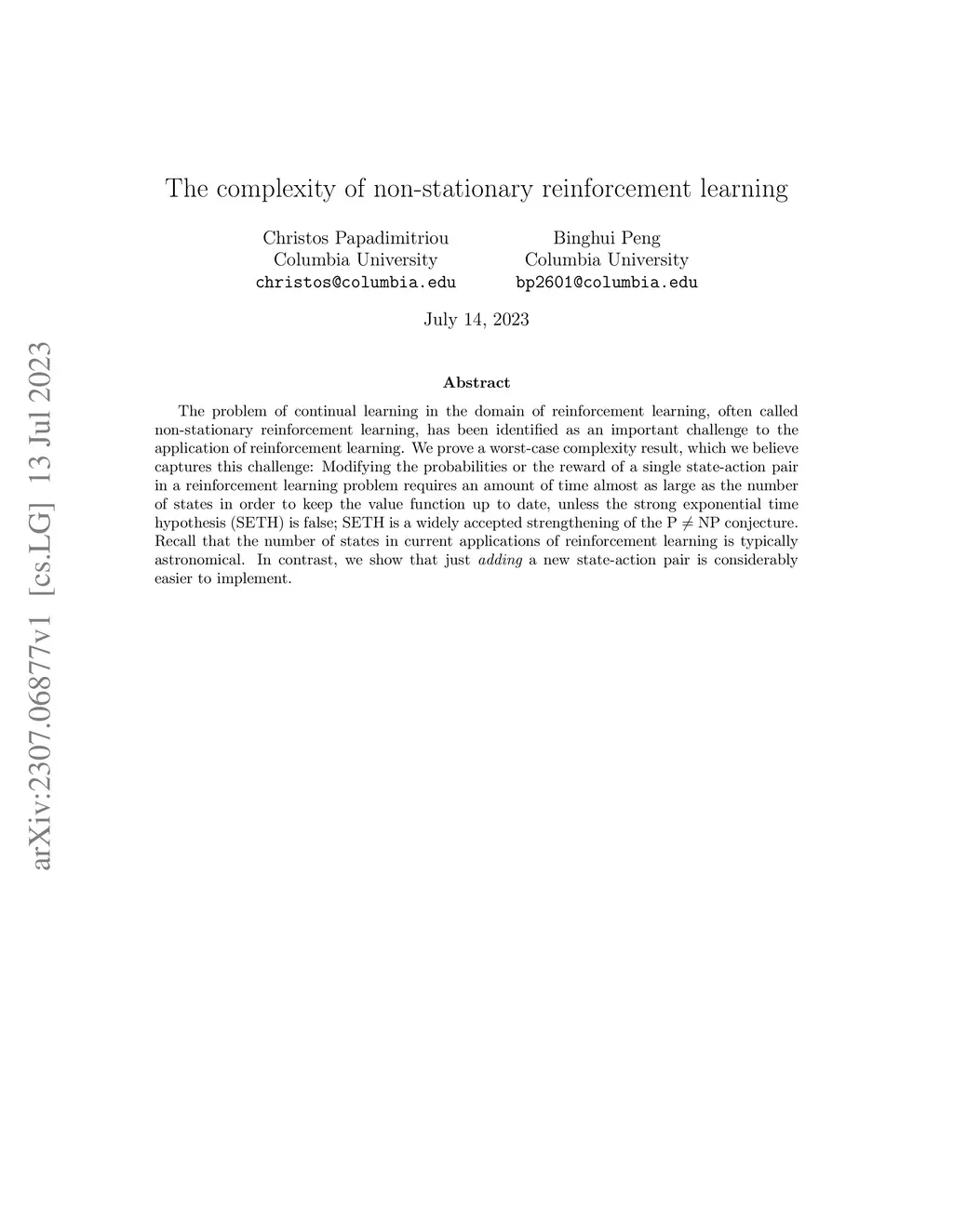The problem of continual learning in the domain of reinforcement learning, often called non-stationary reinforcement learning, has been identified as an important challenge to the application of reinforcement learning. We prove a worst-case complexity result, which we believe captures this challenge: Modifying the probabilities or the reward of a single state-action pair in a reinforcement learning problem requires an amount of time almost as large as the number of states in order to keep the value function up to date, unless the strong exponential time hypothesis (SETH) is false; SETH is a widely accepted strengthening of the P NP conjecture. Recall that the number of states in current applications of reinforcement learning is typically astronomical. In contrast, we show that just a new state-action pair is considerably easier to implement.