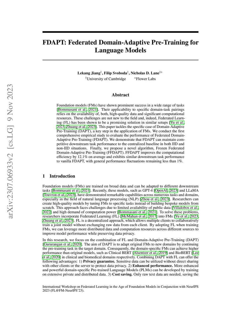Foundation models (FMs) have shown prominent success in a wide range of tasks. Their applicability to specific domain-task pairings relies on the availability of, both, high-quality data and significant computational resources. These challenges are not new to the field and, indeed, Federated Learning (FL) has been shown to be a promising solution in similar setups. This paper tackles the specific case of Domain-Adaptive Pre-Training (DAPT), a key step in the application of FMs. We conduct the first comprehensive empirical study to evaluate the performance of Federated Domain-Adaptive Pre-Training (FDAPT). We demonstrate that FDAPT can maintain competitive downstream task performance to the centralized baseline in both IID and non-IID situations. Finally, we propose a novel algorithm, Frozen Federated Domain-Adaptive Pre-Training (FFDAPT). FFDAPT improves the computational efficiency by 12.1% on average and exhibits similar downstream task performance to vanilla FDAPT, with general performance fluctuations remaining less than 1%.
