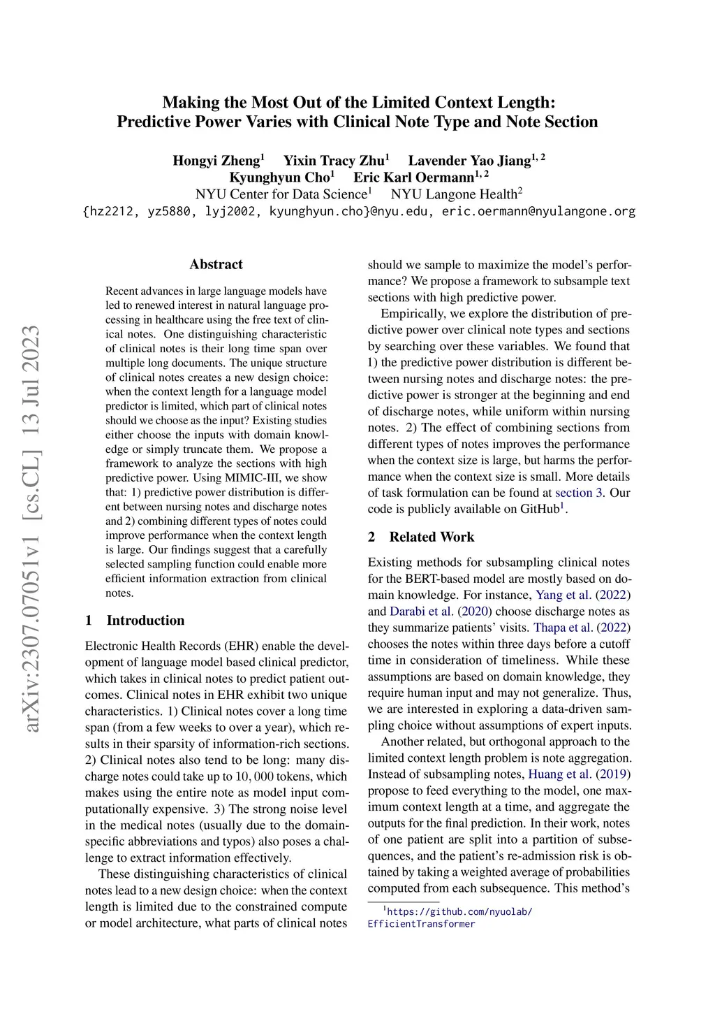 Recent advances in large language models have led to renewed interest in natural language processing in healthcare using the free text of clinical notes. One distinguishing characteristic of clinical notes is their long time span over multiple long documents. The unique structure of clinical notes creates a new design choice: when the context length for a language model predictor is limited, which part of clinical notes should we choose as the input? Existing studies either choose the inputs with domain knowledge or simply truncate them. We propose a framework to analyze the sections with high predictive power. Using MIMIC-III, we show that: 1) predictive power distribution is different between nursing notes and discharge notes and 2) combining different types of notes could improve performance when the context length is large. Our findings suggest that a carefully selected sampling function could enable more efficient information extraction from clinical notes.