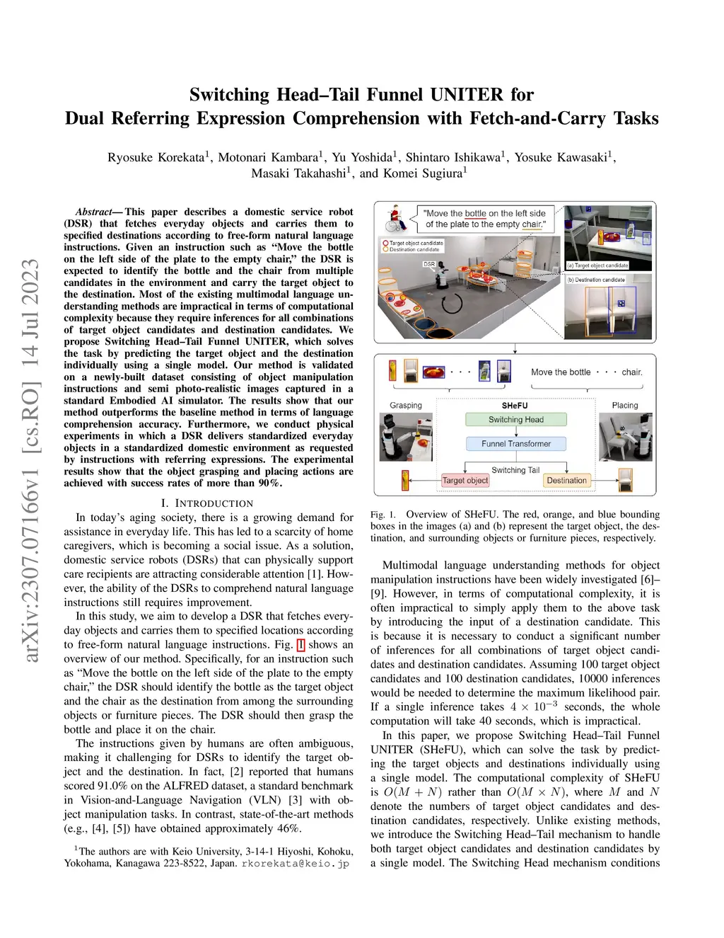 This paper describes a domestic service robot (DSR) that fetches everyday objects and carries them to specified destinations according to free-form natural language instructions. Given an instruction such as "Move the bottle on the left side of the plate to the empty chair," the DSR is expected to identify the bottle and the chair from multiple candidates in the environment and carry the target object to the destination. Most of the existing multimodal language understanding methods are impractical in terms of computational complexity because they require inferences for all combinations of target object candidates and destination candidates. We propose Switching Head-Tail Funnel UNITER, which solves the task by predicting the target object and the destination individually using a single model. Our method is validated on a newly-built dataset consisting of object manipulation instructions and semi photo-realistic images captured in a standard Embodied AI simulator. The results show that our method outperforms the baseline method in terms of language comprehension accuracy. Furthermore, we conduct physical experiments in which a DSR delivers standardized everyday objects in a standardized domestic environment as requested by instructions with referring expressions. The experimental results show that the object grasping and placing actions are achieved with success rates of more than 90%.