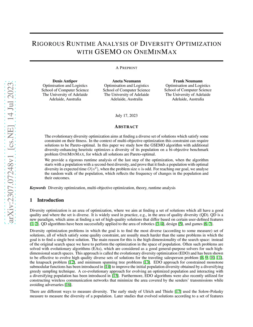 The evolutionary diversity optimization aims at finding a diverse set of solutions which satisfy some constraint on their fitness. In the context of multi-objective optimization this constraint can require solutions to be Pareto-optimal. In this paper we study how the GSEMO algorithm with additional diversity-enhancing heuristic optimizes a diversity of its population on a bi-objective benchmark problem OneMinMax, for which all solutions are Pareto-optimal. We provide a rigorous runtime analysis of the last step of the optimization, when the algorithm starts with a population with a second-best diversity, and prove that it finds a population with optimal diversity in expected time , when the problem size is odd. For reaching our goal, we analyse the random walk of the population, which reflects the frequency of changes in the population and their outcomes.