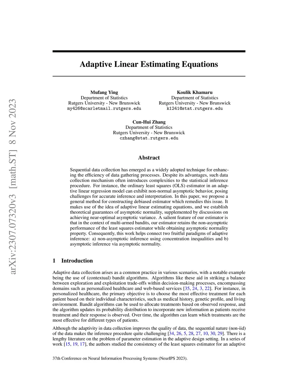 Sequential data collection has emerged as a widely adopted technique for enhancing the efficiency of data gathering processes. Despite its advantages, such data collection mechanism often introduces complexities to the statistical inference procedure. For instance, the ordinary least squares (OLS) estimator in an adaptive linear regression model can exhibit non-normal asymptotic behavior, posing challenges for accurate inference and interpretation. In this paper, we propose a general method for constructing debiased estimator which remedies this issue. It makes use of the idea of adaptive linear estimating equations, and we establish theoretical guarantees of asymptotic normality, supplemented by discussions on achieving near-optimal asymptotic variance. A salient feature of our estimator is that in the context of multi-armed bandits, our estimator retains the non-asymptotic performance of the least square estimator while obtaining asymptotic normality property. Consequently, this work helps connect two fruitful paradigms of adaptive inference: a) non-asymptotic inference using concentration inequalities and b) asymptotic inference via asymptotic normality.