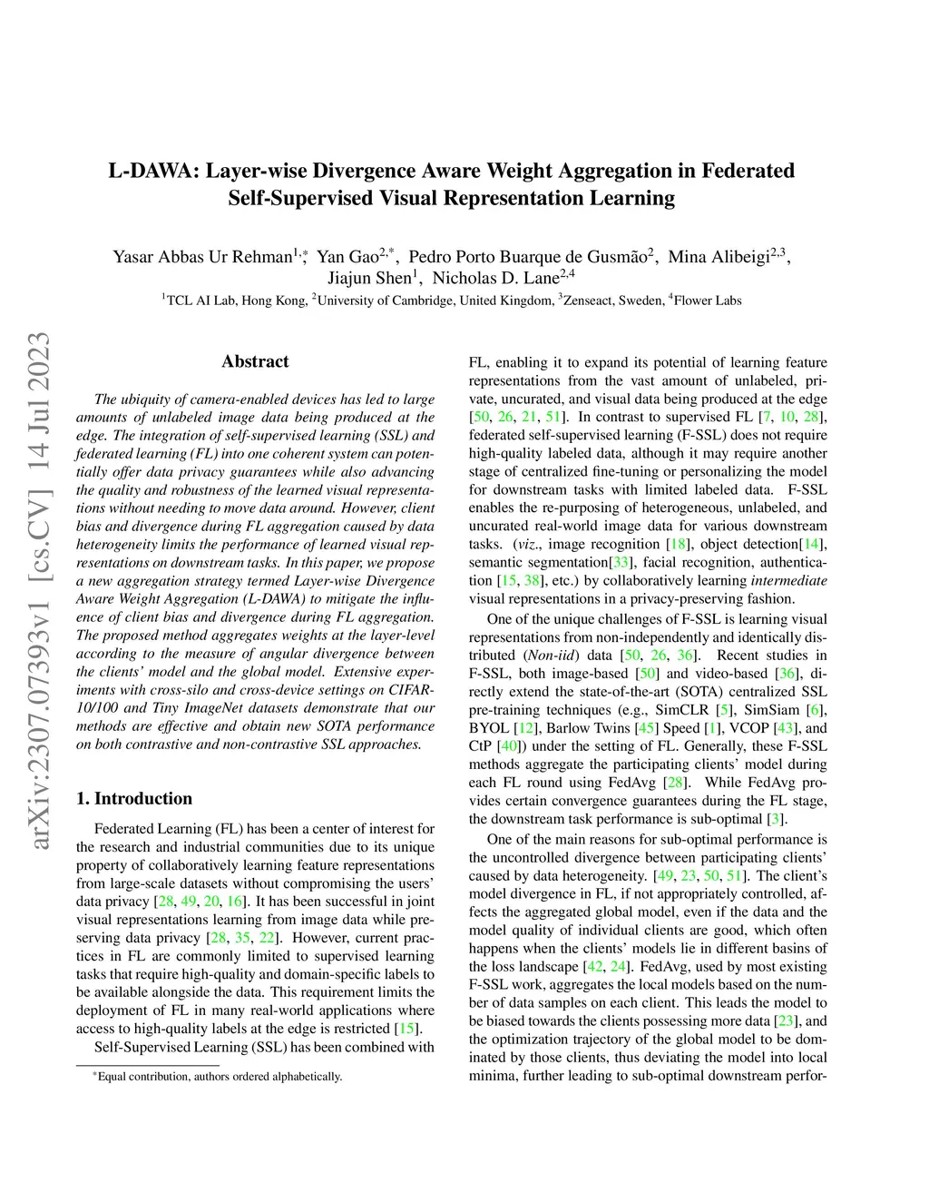 The ubiquity of camera-enabled devices has led to large amounts of unlabeled image data being produced at the edge. The integration of self-supervised learning (SSL) and federated learning (FL) into one coherent system can potentially offer data privacy guarantees while also advancing the quality and robustness of the learned visual representations without needing to move data around. However, client bias and divergence during FL aggregation caused by data heterogeneity limits the performance of learned visual representations on downstream tasks. In this paper, we propose a new aggregation strategy termed Layer-wise Divergence Aware Weight Aggregation (L-DAWA) to mitigate the influence of client bias and divergence during FL aggregation. The proposed method aggregates weights at the layer-level according to the measure of angular divergence between the clients' model and the global model. Extensive experiments with cross-silo and cross-device settings on CIFAR-10/100 and Tiny ImageNet datasets demonstrate that our methods are effective and obtain new SOTA performance on both contrastive and non-contrastive SSL approaches.
