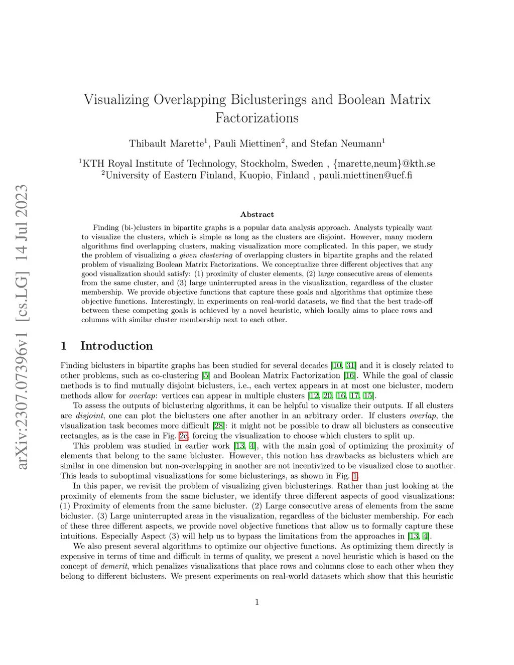 Finding (bi-)clusters in bipartite graphs is a popular data analysis approach. Analysts typically want to visualize the clusters, which is simple as long as the clusters are disjoint. However, many modern algorithms find overlapping clusters, making visualization more complicated. In this paper, we study the problem of visualizing \emph{a given clustering} of overlapping clusters in bipartite graphs and the related problem of visualizing Boolean Matrix Factorizations. We conceptualize three different objectives that any good visualization should satisfy: (1) proximity of cluster elements, (2) large consecutive areas of elements from the same cluster, and (3) large uninterrupted areas in the visualization, regardless of the cluster membership. We provide objective functions that capture these goals and algorithms that optimize these objective functions. Interestingly, in experiments on real-world datasets, we find that the best trade-off between these competing goals is achieved by a novel heuristic, which locally aims to place rows and columns with similar cluster membership next to each other.