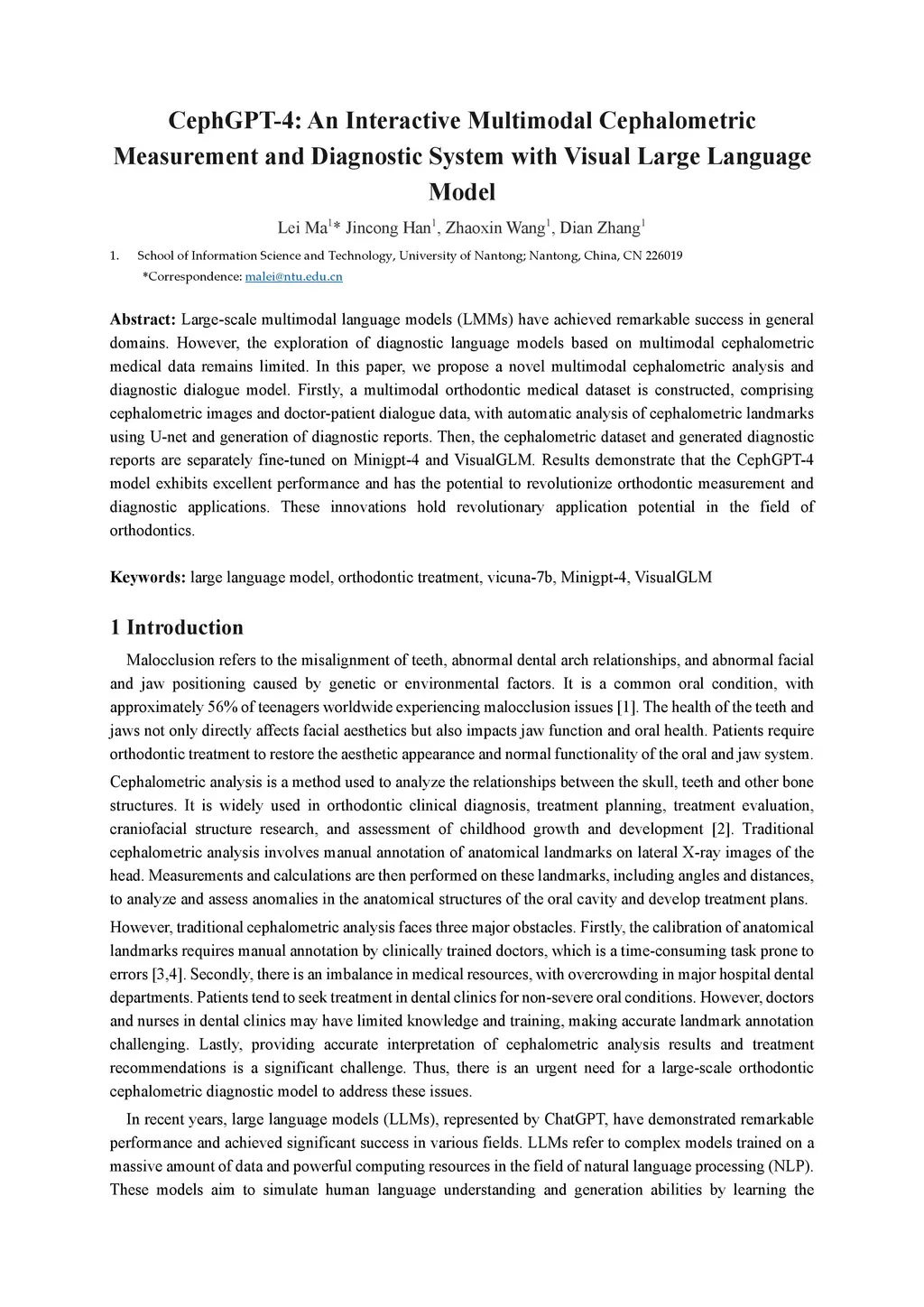 Large-scale multimodal language models (LMMs) have achieved remarkable success in general domains. However, the exploration of diagnostic language models based on multimodal cephalometric medical data remains limited. In this paper, we propose a novel multimodal cephalometric analysis and diagnostic dialogue model. Firstly, a multimodal orthodontic medical dataset is constructed, comprising cephalometric images and doctor-patient dialogue data, with automatic analysis of cephalometric landmarks using U-net and generation of diagnostic reports. Then, the cephalometric dataset and generated diagnostic reports are separately fine-tuned on Minigpt-4 and VisualGLM. Results demonstrate that the CephGPT-4 model exhibits excellent performance and has the potential to revolutionize orthodontic measurement and diagnostic applications. These innovations hold revolutionary application potential in the field of orthodontics.