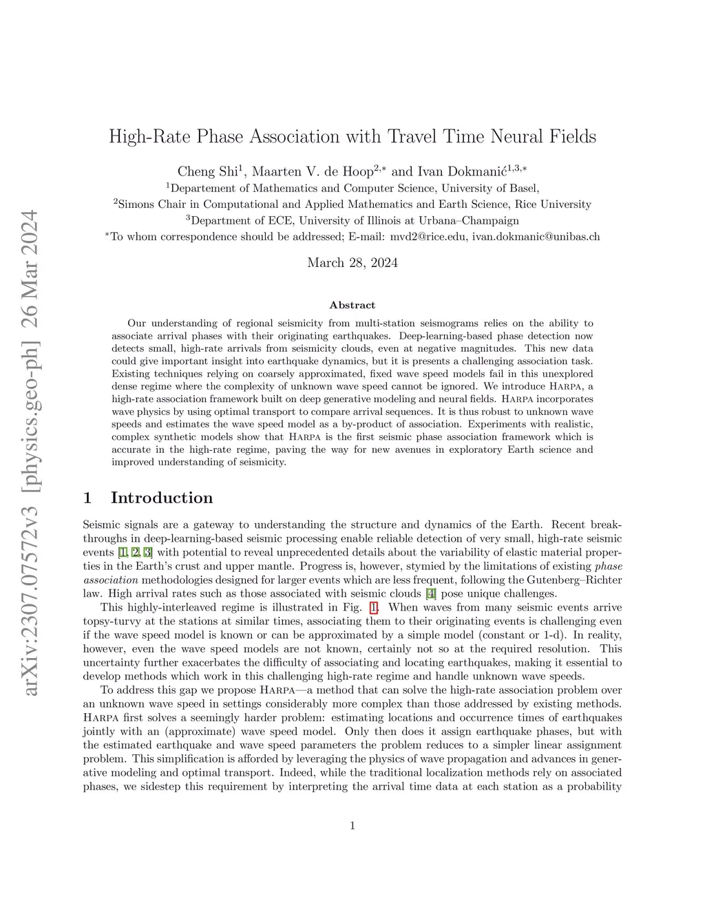 Our understanding of regional seismicity from multi-station seismograms relies on the ability to associate arrival phases with their originating earthquakes. Deep-learning-based phase detection now detects small, high-rate arrivals from seismicity clouds, even at negative magnitudes. This new data could give important insight into earthquake dynamics, but it is presents a challenging association task. Existing techniques relying on coarsely approximated, fixed wave speed models fail in this unexplored dense regime where the complexity of unknown wave speed cannot be ignored. We introduce Harpa, a high-rate association framework built on deep generative modeling and neural fields. Harpa incorporates wave physics by using optimal transport to compare arrival sequences. It is thus robust to unknown wave speeds and estimates the wave speed model as a by-product of association. Experiments with realistic, complex synthetic models show that Harpa is the first seismic phase association framework which is accurate in the high-rate regime, paving the way for new avenues in exploratory Earth science and improved understanding of seismicity.