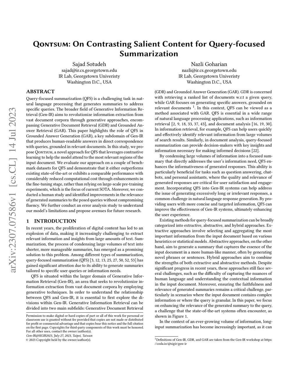 Query-focused summarization (QFS) is a challenging task in natural language processing that generates summaries to address specific queries. The broader field of Generative Information Retrieval (Gen-IR) aims to revolutionize information extraction from vast document corpora through generative approaches, encompassing Generative Document Retrieval (GDR) and Grounded Answer Retrieval (GAR). This paper highlights the role of QFS in Grounded Answer Generation (GAR), a key subdomain of Gen-IR that produces human-readable answers in direct correspondence with queries, grounded in relevant documents. In this study, we propose QontSum, a novel approach for QFS that leverages contrastive learning to help the model attend to the most relevant regions of the input document. We evaluate our approach on a couple of benchmark datasets for QFS and demonstrate that it either outperforms existing state-of-the-art or exhibits a comparable performance with considerably reduced computational cost through enhancements in the fine-tuning stage, rather than relying on large-scale pre-training experiments, which is the focus of current SOTA. Moreover, we conducted a human study and identified improvements in the relevance of generated summaries to the posed queries without compromising fluency. We further conduct an error analysis study to understand our model's limitations and propose avenues for future research.