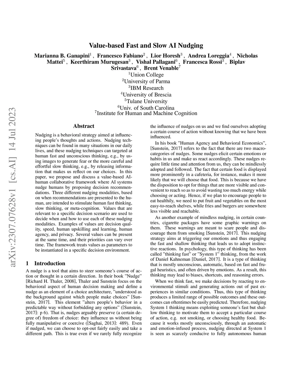 Nudging is a behavioral strategy aimed at influencing people's thoughts and actions. Nudging techniques can be found in many situations in our daily lives, and these nudging techniques can targeted at human fast and unconscious thinking, e.g., by using images to generate fear or the more careful and effortful slow thinking, e.g., by releasing information that makes us reflect on our choices. In this paper, we propose and discuss a value-based AI-human collaborative framework where AI systems nudge humans by proposing decision recommendations. Three different nudging modalities, based on when recommendations are presented to the human, are intended to stimulate human fast thinking, slow thinking, or meta-cognition. Values that are relevant to a specific decision scenario are used to decide when and how to use each of these nudging modalities. Examples of values are decision quality, speed, human upskilling and learning, human agency, and privacy. Several values can be present at the same time, and their priorities can vary over time. The framework treats values as parameters to be instantiated in a specific decision environment.