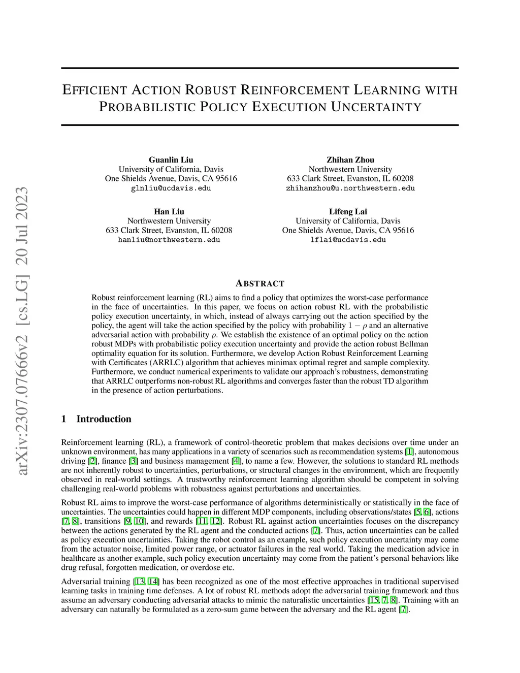 Robust reinforcement learning (RL) aims to find a policy that optimizes the worst-case performance in the face of uncertainties. In this paper, we focus on action robust RL with the probabilistic policy execution uncertainty, in which, instead of always carrying out the action specified by the policy, the agent will take the action specified by the policy with probability and an alternative adversarial action with probability . We establish the existence of an optimal policy on the action robust MDPs with probabilistic policy execution uncertainty and provide the action robust Bellman optimality equation for its solution. Furthermore, we develop Action Robust Reinforcement Learning with Certificates (ARRLC) algorithm that achieves minimax optimal regret and sample complexity. Furthermore, we conduct numerical experiments to validate our approach's robustness, demonstrating that ARRLC outperforms non-robust RL algorithms and converges faster than the robust TD algorithm in the presence of action perturbations.