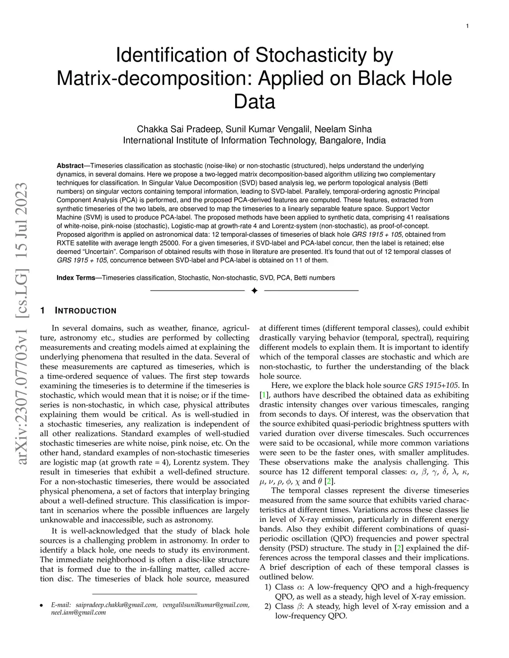 Timeseries classification as stochastic (noise-like) or non-stochastic (structured), helps understand the underlying dynamics, in several domains. Here we propose a two-legged matrix decomposition-based algorithm utilizing two complementary techniques for classification. In Singular Value Decomposition (SVD) based analysis leg, we perform topological analysis (Betti numbers) on singular vectors containing temporal information, leading to SVD-label. Parallely, temporal-ordering agnostic Principal Component Analysis (PCA) is performed, and the proposed PCA-derived features are computed. These features, extracted from synthetic timeseries of the two labels, are observed to map the timeseries to a linearly separable feature space. Support Vector Machine (SVM) is used to produce PCA-label. The proposed methods have been applied to synthetic data, comprising 41 realisations of white-noise, pink-noise (stochastic), Logistic-map at growth-rate 4 and Lorentz-system (non-stochastic), as proof-of-concept. Proposed algorithm is applied on astronomical data: 12 temporal-classes of timeseries of black hole GRS 1915+105, obtained from RXTE satellite with average length 25000. For a given timeseries, if SVD-label and PCA-label concur, then the label is retained; else deemed "Uncertain". Comparison of obtained results with those in literature are presented. It's found that out of 12 temporal classes of GRS 1915+105, concurrence between SVD-label and PCA-label is obtained on 11 of them.