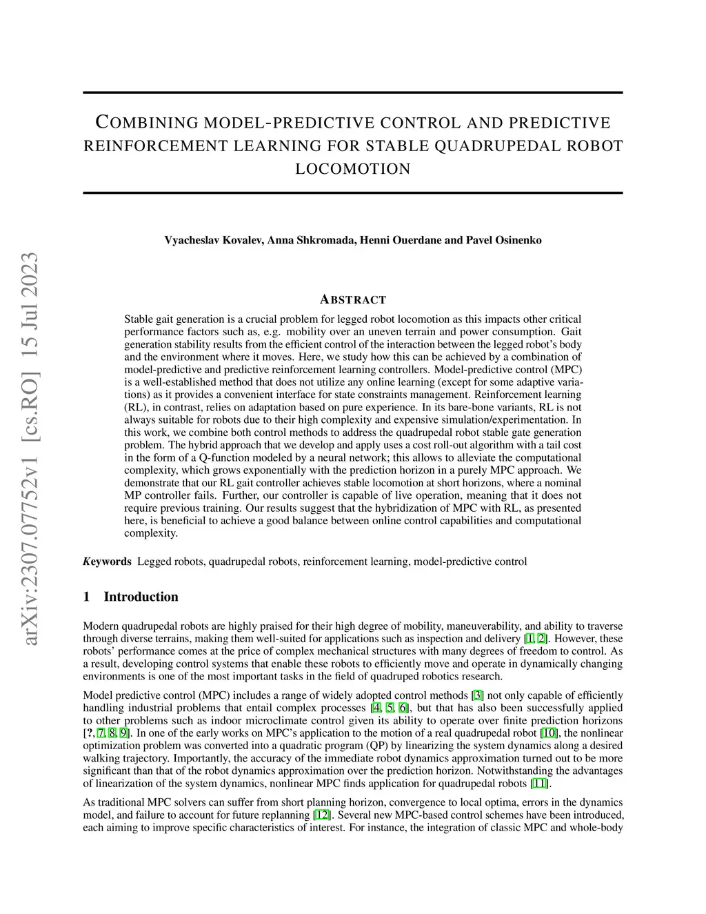Stable gait generation is a crucial problem for legged robot locomotion as this impacts other critical performance factors such as, e.g. mobility over an uneven terrain and power consumption. Gait generation stability results from the efficient control of the interaction between the legged robot's body and the environment where it moves. Here, we study how this can be achieved by a combination of model-predictive and predictive reinforcement learning controllers. Model-predictive control (MPC) is a well-established method that does not utilize any online learning (except for some adaptive variations) as it provides a convenient interface for state constraints management. Reinforcement learning (RL), in contrast, relies on adaptation based on pure experience. In its bare-bone variants, RL is not always suitable for robots due to their high complexity and expensive simulation/experimentation. In this work, we combine both control methods to address the quadrupedal robot stable gate generation problem. The hybrid approach that we develop and apply uses a cost roll-out algorithm with a tail cost in the form of a Q-function modeled by a neural network; this allows to alleviate the computational complexity, which grows exponentially with the prediction horizon in a purely MPC approach. We demonstrate that our RL gait controller achieves stable locomotion at short horizons, where a nominal MP controller fails. Further, our controller is capable of live operation, meaning that it does not require previous training. Our results suggest that the hybridization of MPC with RL, as presented here, is beneficial to achieve a good balance between online control capabilities and computational complexity.