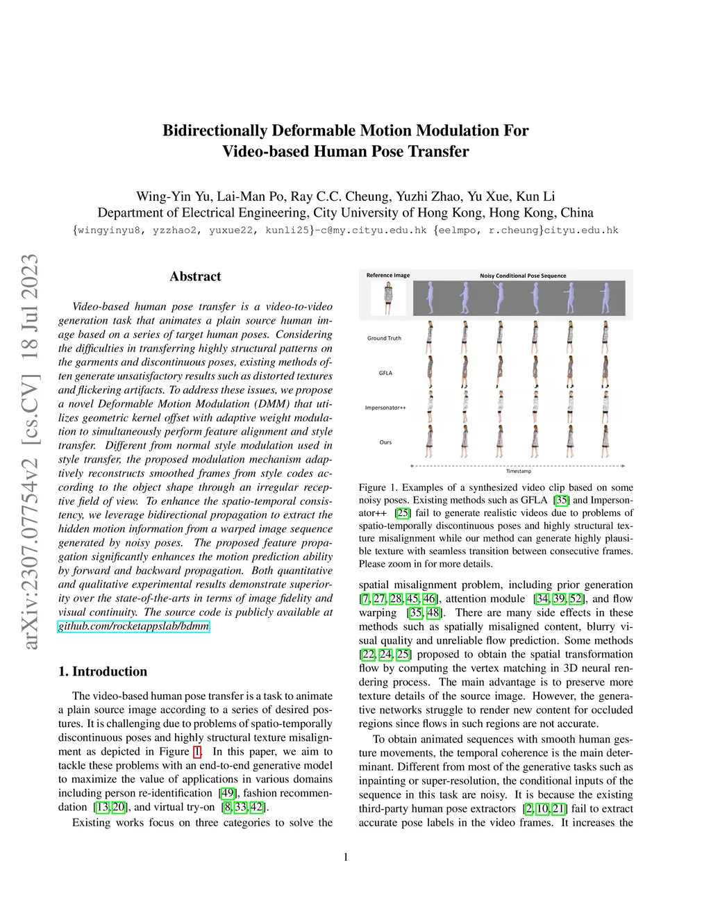 Video-based human pose transfer is a video-to-video generation task that animates a plain source human image based on a series of target human poses. Considering the difficulties in transferring highly structural patterns on the garments and discontinuous poses, existing methods often generate unsatisfactory results such as distorted textures and flickering artifacts. To address these issues, we propose a novel Deformable Motion Modulation (DMM) that utilizes geometric kernel offset with adaptive weight modulation to simultaneously perform feature alignment and style transfer. Different from normal style modulation used in style transfer, the proposed modulation mechanism adaptively reconstructs smoothed frames from style codes according to the object shape through an irregular receptive field of view. To enhance the spatio-temporal consistency, we leverage bidirectional propagation to extract the hidden motion information from a warped image sequence generated by noisy poses. The proposed feature propagation significantly enhances the motion prediction ability by forward and backward propagation. Both quantitative and qualitative experimental results demonstrate superiority over the state-of-the-arts in terms of image fidelity and visual continuity. The source code is publicly available at github.com/rocketappslab/bdmm.