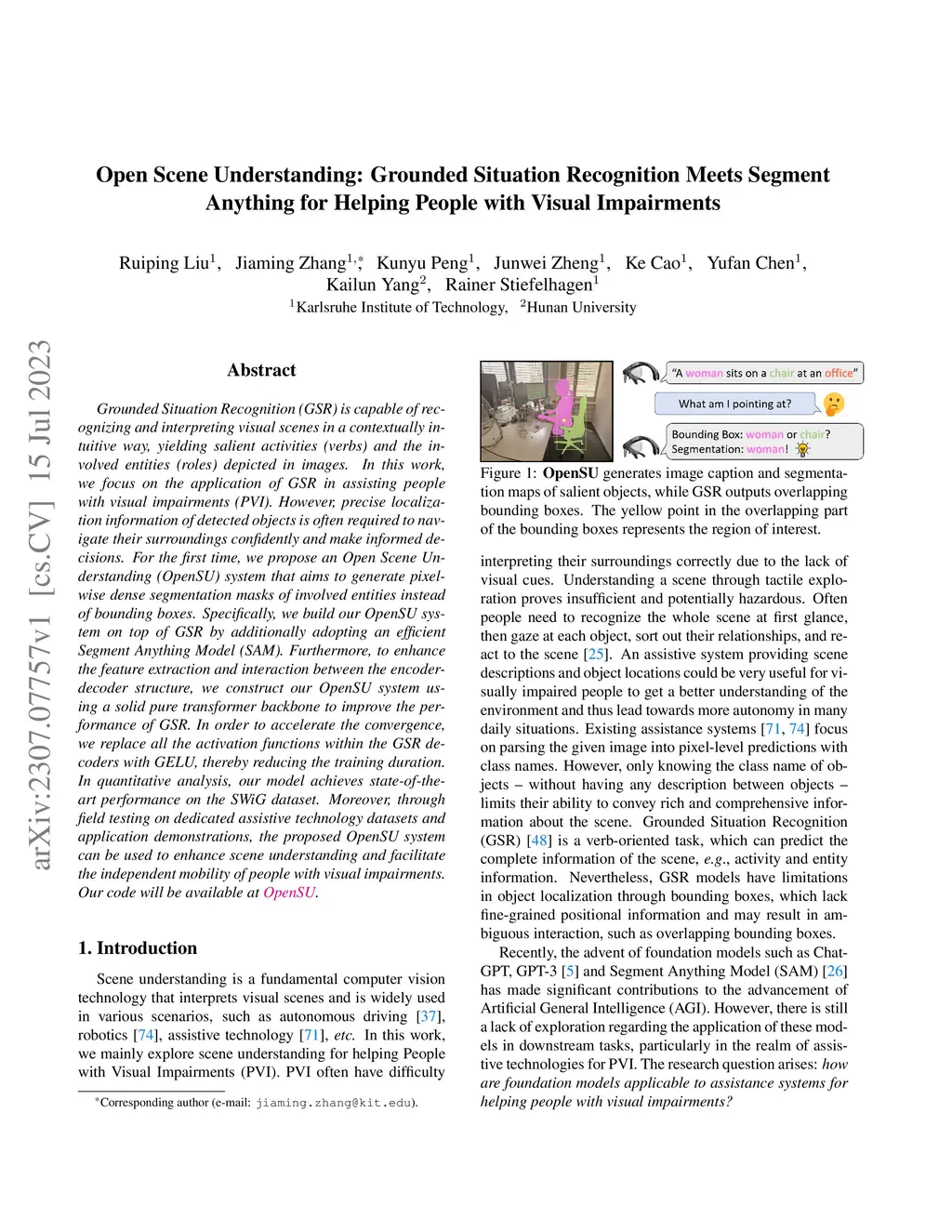 Grounded Situation Recognition (GSR) is capable of recognizing and interpreting visual scenes in a contextually intuitive way, yielding salient activities (verbs) and the involved entities (roles) depicted in images. In this work, we focus on the application of GSR in assisting people with visual impairments (PVI). However, precise localization information of detected objects is often required to navigate their surroundings confidently and make informed decisions. For the first time, we propose an Open Scene Understanding (OpenSU) system that aims to generate pixel-wise dense segmentation masks of involved entities instead of bounding boxes. Specifically, we build our OpenSU system on top of GSR by additionally adopting an efficient Segment Anything Model (SAM). Furthermore, to enhance the feature extraction and interaction between the encoder-decoder structure, we construct our OpenSU system using a solid pure transformer backbone to improve the performance of GSR. In order to accelerate the convergence, we replace all the activation functions within the GSR decoders with GELU, thereby reducing the training duration. In quantitative analysis, our model achieves state-of-the-art performance on the SWiG dataset. Moreover, through field testing on dedicated assistive technology datasets and application demonstrations, the proposed OpenSU system can be used to enhance scene understanding and facilitate the independent mobility of people with visual impairments. Our code will be available at https://github.com/RuipingL/OpenSU.