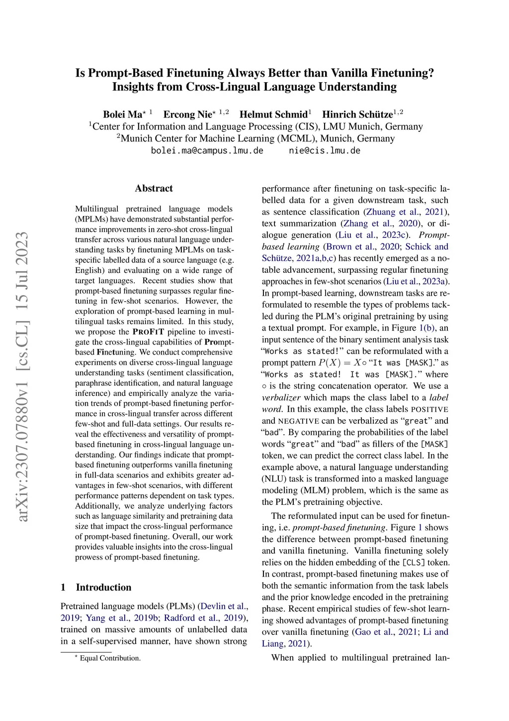 Multilingual pretrained language models (MPLMs) have demonstrated substantial performance improvements in zero-shot cross-lingual transfer across various natural language understanding tasks by finetuning MPLMs on task-specific labelled data of a source language (e.g. English) and evaluating on a wide range of target languages. Recent studies show that prompt-based finetuning surpasses regular finetuning in few-shot scenarios. However, the exploration of prompt-based learning in multilingual tasks remains limited. In this study, we propose the ProFiT pipeline to investigate the cross-lingual capabilities of Prompt-based Finetuning. We conduct comprehensive experiments on diverse cross-lingual language understanding tasks (sentiment classification, paraphrase identification, and natural language inference) and empirically analyze the variation trends of prompt-based finetuning performance in cross-lingual transfer across different few-shot and full-data settings. Our results reveal the effectiveness and versatility of prompt-based finetuning in cross-lingual language understanding. Our findings indicate that prompt-based finetuning outperforms vanilla finetuning in full-data scenarios and exhibits greater advantages in few-shot scenarios, with different performance patterns dependent on task types. Additionally, we analyze underlying factors such as language similarity and pretraining data size that impact the cross-lingual performance of prompt-based finetuning. Overall, our work provides valuable insights into the cross-lingual prowess of prompt-based finetuning.
