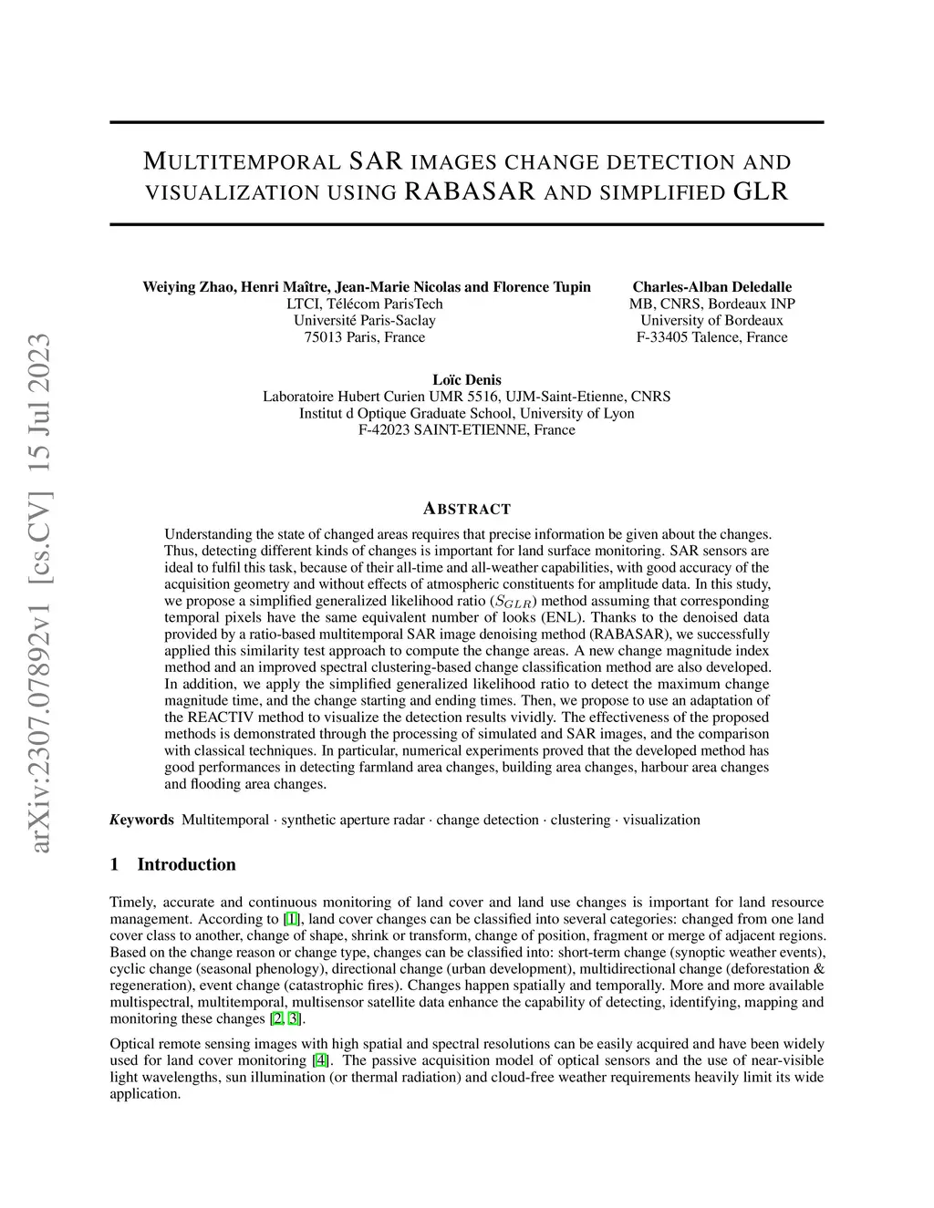 Understanding the state of changed areas requires that precise information be given about the changes. Thus, detecting different kinds of changes is important for land surface monitoring. SAR sensors are ideal to fulfil this task, because of their all-time and all-weather capabilities, with good accuracy of the acquisition geometry and without effects of atmospheric constituents for amplitude data. In this study, we propose a simplified generalized likelihood ratio () method assuming that corresponding temporal pixels have the same equivalent number of looks (ENL). Thanks to the denoised data provided by a ratio-based multitemporal SAR image denoising method (RABASAR), we successfully applied this similarity test approach to compute the change areas. A new change magnitude index method and an improved spectral clustering-based change classification method are also developed. In addition, we apply the simplified generalized likelihood ratio to detect the maximum change magnitude time, and the change starting and ending times. Then, we propose to use an adaptation of the REACTIV method to visualize the detection results vividly. The effectiveness of the proposed methods is demonstrated through the processing of simulated and SAR images, and the comparison with classical techniques. In particular, numerical experiments proved that the developed method has good performances in detecting farmland area changes, building area changes, harbour area changes and flooding area changes.