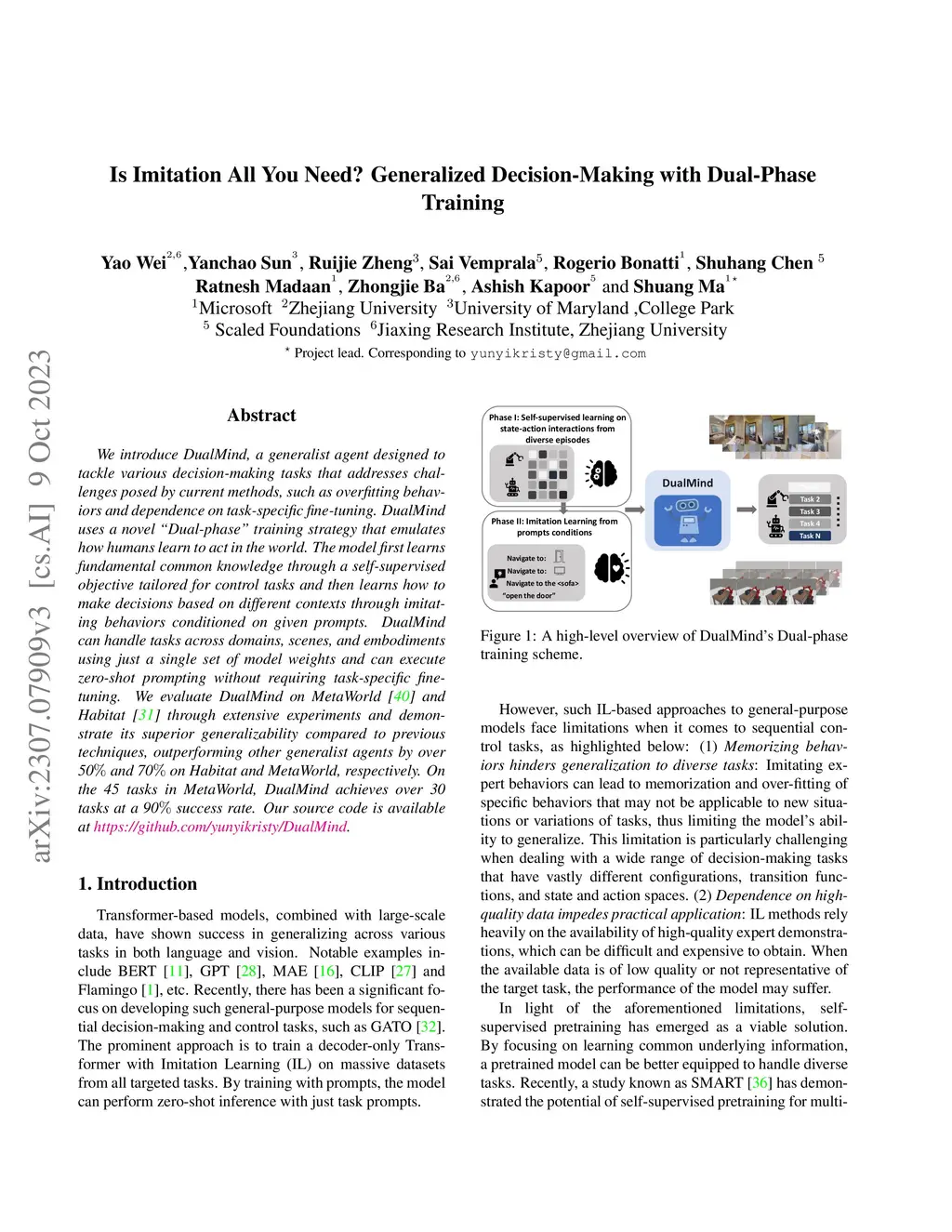 We introduce DualMind, a generalist agent designed to tackle various decision-making tasks that addresses challenges posed by current methods, such as overfitting behaviors and dependence on task-specific fine-tuning. DualMind uses a novel "Dual-phase" training strategy that emulates how humans learn to act in the world. The model first learns fundamental common knowledge through a self-supervised objective tailored for control tasks and then learns how to make decisions based on different contexts through imitating behaviors conditioned on given prompts. DualMind can handle tasks across domains, scenes, and embodiments using just a single set of model weights and can execute zero-shot prompting without requiring task-specific fine-tuning. We evaluate DualMind on MetaWorld and Habitat through extensive experiments and demonstrate its superior generalizability compared to previous techniques, outperforming other generalist agents by over 50 and 70 on Habitat and MetaWorld, respectively. On the 45 tasks in MetaWorld, DualMind achieves over 30 tasks at a 90 success rate.