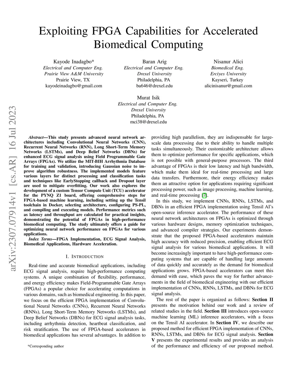 This study presents advanced neural network architectures including Convolutional Neural Networks (CNN), Recurrent Neural Networks (RNN), Long Short-Term Memory Networks (LSTMs), and Deep Belief Networks (DBNs) for enhanced ECG signal analysis using Field Programmable Gate Arrays (FPGAs). We utilize the MIT-BIH Arrhythmia Database for training and validation, introducing Gaussian noise to improve algorithm robustness. The implemented models feature various layers for distinct processing and classification tasks and techniques like EarlyStopping callback and Dropout layer are used to mitigate overfitting. Our work also explores the development of a custom Tensor Compute Unit (TCU) accelerator for the PYNQ Z1 board, offering comprehensive steps for FPGA-based machine learning, including setting up the Tensil toolchain in Docker, selecting architecture, configuring PS-PL, and compiling and executing models. Performance metrics such as latency and throughput are calculated for practical insights, demonstrating the potential of FPGAs in high-performance biomedical computing. The study ultimately offers a guide for optimizing neural network performance on FPGAs for various applications.