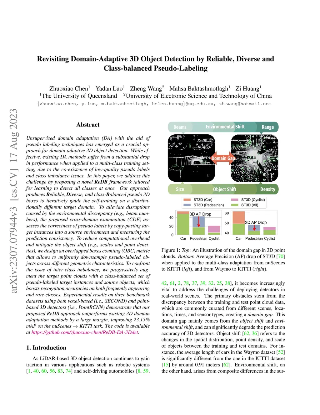 Unsupervised domain adaptation (DA) with the aid of pseudo labeling techniques has emerged as a crucial approach for domain-adaptive 3D object detection. While effective, existing DA methods suffer from a substantial drop in performance when applied to a multi-class training setting, due to the co-existence of low-quality pseudo labels and class imbalance issues. In this paper, we address this challenge by proposing a novel ReDB framework tailored for learning to detect all classes at once. Our approach produces Reliable, Diverse, and class-Balanced pseudo 3D boxes to iteratively guide the self-training on a distributionally different target domain. To alleviate disruptions caused by the environmental discrepancy (e.g., beam numbers), the proposed cross-domain examination (CDE) assesses the correctness of pseudo labels by copy-pasting target instances into a source environment and measuring the prediction consistency. To reduce computational overhead and mitigate the object shift (e.g., scales and point densities), we design an overlapped boxes counting (OBC) metric that allows to uniformly downsample pseudo-labeled objects across different geometric characteristics. To confront the issue of inter-class imbalance, we progressively augment the target point clouds with a class-balanced set of pseudo-labeled target instances and source objects, which boosts recognition accuracies on both frequently appearing and rare classes. Experimental results on three benchmark datasets using both voxel-based (i.e., SECOND) and point-based 3D detectors (i.e., PointRCNN) demonstrate that our proposed ReDB approach outperforms existing 3D domain adaptation methods by a large margin, improving 23.15% mAP on the nuScenes KITTI task. The code is available at https://github.com/zhuoxiao-chen/ReDB-DA-3Ddet.