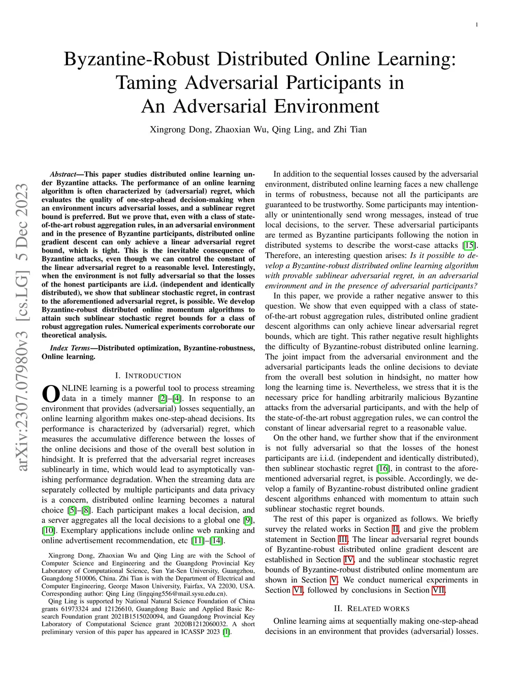 This paper studies distributed online learning under Byzantine attacks. The performance of an online learning algorithm is often characterized by (adversarial) regret, which evaluates the quality of one-step-ahead decision-making when an environment provides adversarial losses, and a sublinear bound is preferred. But we prove that, even with a class of state-of-the-art robust aggregation rules, in an adversarial environment and in the presence of Byzantine participants, distributed online gradient descent can only achieve a linear adversarial regret bound, which is tight. This is the inevitable consequence of Byzantine attacks, even though we can control the constant of the linear adversarial regret to a reasonable level. Interestingly, when the environment is not fully adversarial so that the losses of the honest participants are i.i.d. (independent and identically distributed), we show that sublinear stochastic regret, in contrast to the aforementioned adversarial regret, is possible. We develop a Byzantine-robust distributed online momentum algorithm to attain such a sublinear stochastic regret bound. Extensive numerical experiments corroborate our theoretical analysis.