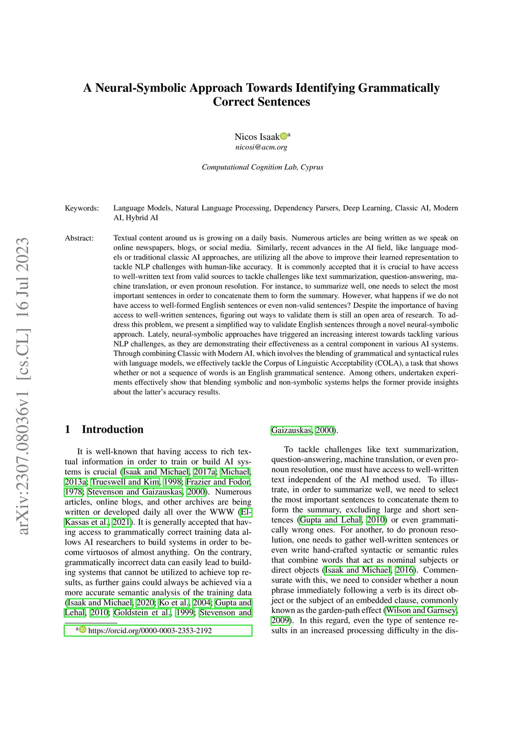 Textual content around us is growing on a daily basis. Numerous articles are being written as we speak on online newspapers, blogs, or social media. Similarly, recent advances in the AI field, like language models or traditional classic AI approaches, are utilizing all the above to improve their learned representation to tackle NLP challenges with human-like accuracy. It is commonly accepted that it is crucial to have access to well-written text from valid sources to tackle challenges like text summarization, question-answering, machine translation, or even pronoun resolution. For instance, to summarize well, one needs to select the most important sentences in order to concatenate them to form the summary. However, what happens if we do not have access to well-formed English sentences or even non-valid sentences? Despite the importance of having access to well-written sentences, figuring out ways to validate them is still an open area of research. To address this problem, we present a simplified way to validate English sentences through a novel neural-symbolic approach. Lately, neural-symbolic approaches have triggered an increasing interest towards tackling various NLP challenges, as they are demonstrating their effectiveness as a central component in various AI systems. Through combining Classic with Modern AI, which involves the blending of grammatical and syntactical rules with language models, we effectively tackle the Corpus of Linguistic Acceptability (COLA), a task that shows whether or not a sequence of words is an English grammatical sentence. Among others, undertaken experiments effectively show that blending symbolic and non-symbolic systems helps the former provide insights about the latter's accuracy results.
