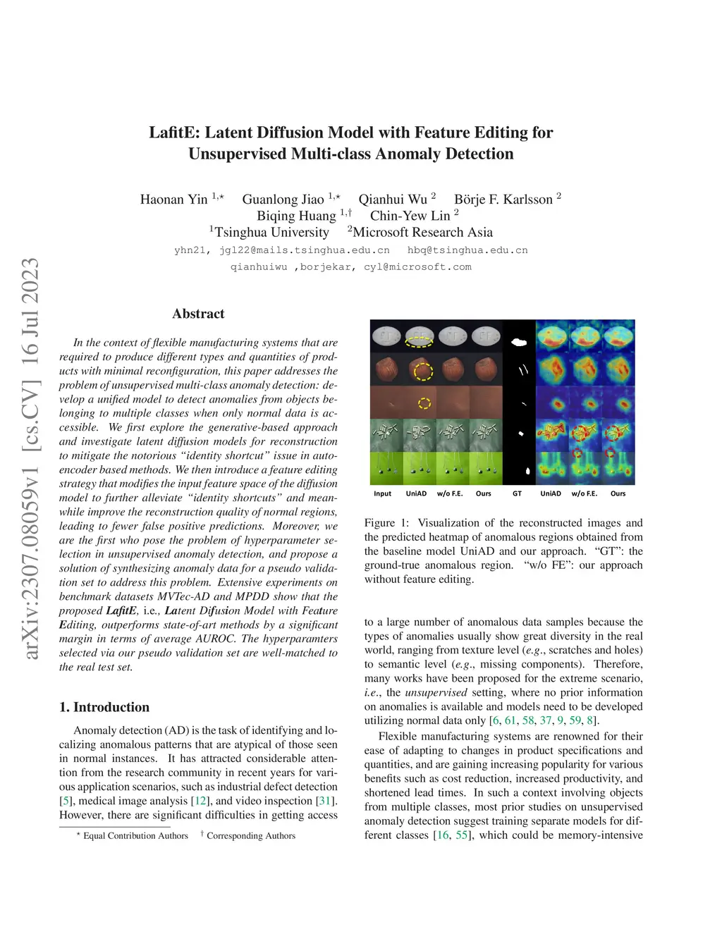 In the context of flexible manufacturing systems that are required to produce different types and quantities of products with minimal reconfiguration, this paper addresses the problem of unsupervised multi-class anomaly detection: develop a unified model to detect anomalies from objects belonging to multiple classes when only normal data is accessible. We first explore the generative-based approach and investigate latent diffusion models for reconstruction to mitigate the notorious ``identity shortcut'' issue in auto-encoder based methods. We then introduce a feature editing strategy that modifies the input feature space of the diffusion model to further alleviate ``identity shortcuts'' and meanwhile improve the reconstruction quality of normal regions, leading to fewer false positive predictions. Moreover, we are the first who pose the problem of hyperparameter selection in unsupervised anomaly detection, and propose a solution of synthesizing anomaly data for a pseudo validation set to address this problem. Extensive experiments on benchmark datasets MVTec-AD and MPDD show that the proposed LafitE, \ie, Latent Diffusion Model with Feature Editing, outperforms state-of-art methods by a significant margin in terms of average AUROC. The hyperparamters selected via our pseudo validation set are well-matched to the real test set.