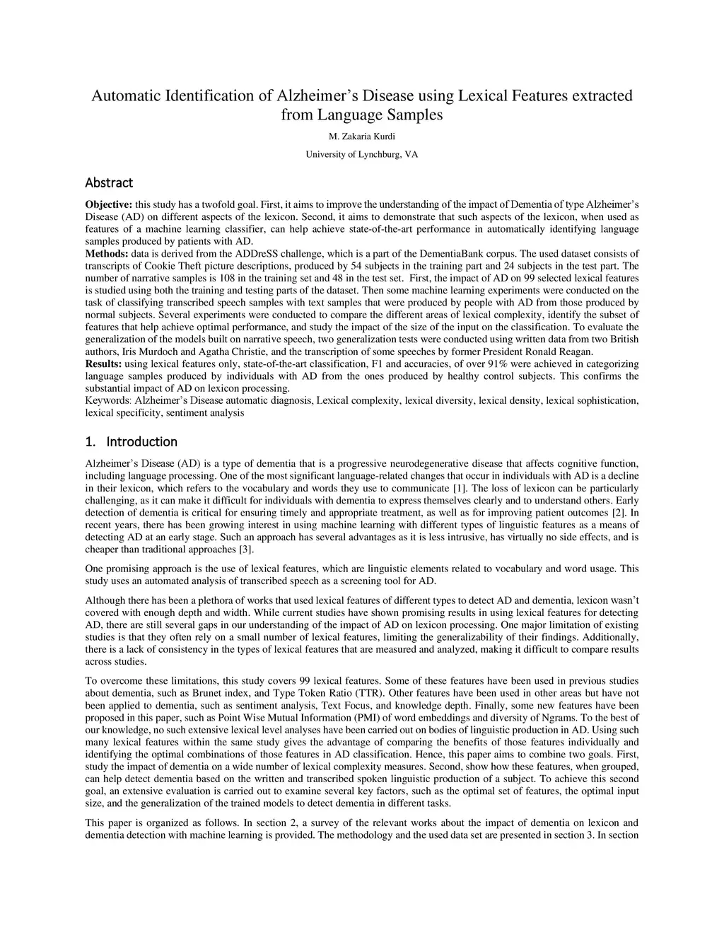Automatic Identification of Alzheimer's Disease using Lexical Features