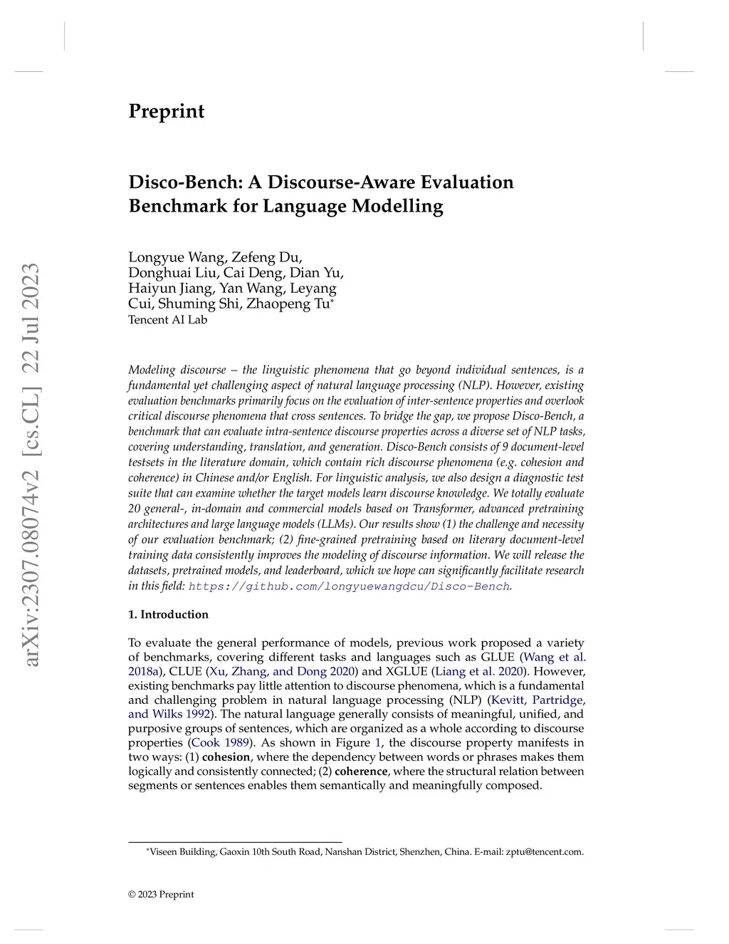 Disco-Bench: A Discourse-Aware Evaluation Benchmark for Language