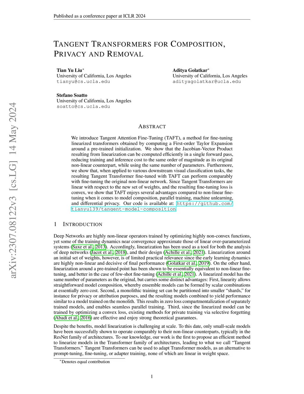 We introduce Tangent Attention Fine-Tuning (TAFT), a method for fine-tuning linearized transformers obtained by computing a First-order Taylor Expansion around a pre-trained initialization. We show that the Jacobian-Vector Product resulting from linearization can be computed efficiently in a single forward pass, reducing training and inference cost to the same order of magnitude as its original non-linear counterpart, while using the same number of parameters. Furthermore, we show that, when applied to various downstream visual classification tasks, the resulting Tangent Transformer fine-tuned with TAFT can perform comparably with fine-tuning the original non-linear network. Since Tangent Transformers are linear with respect to the new set of weights, and the resulting fine-tuning loss is convex, we show that TAFT enjoys several advantages compared to non-linear fine-tuning when it comes to model composition, parallel training, machine unlearning, and differential privacy. Our code is available at: https://github.com/tianyu139/tangent-model-composition