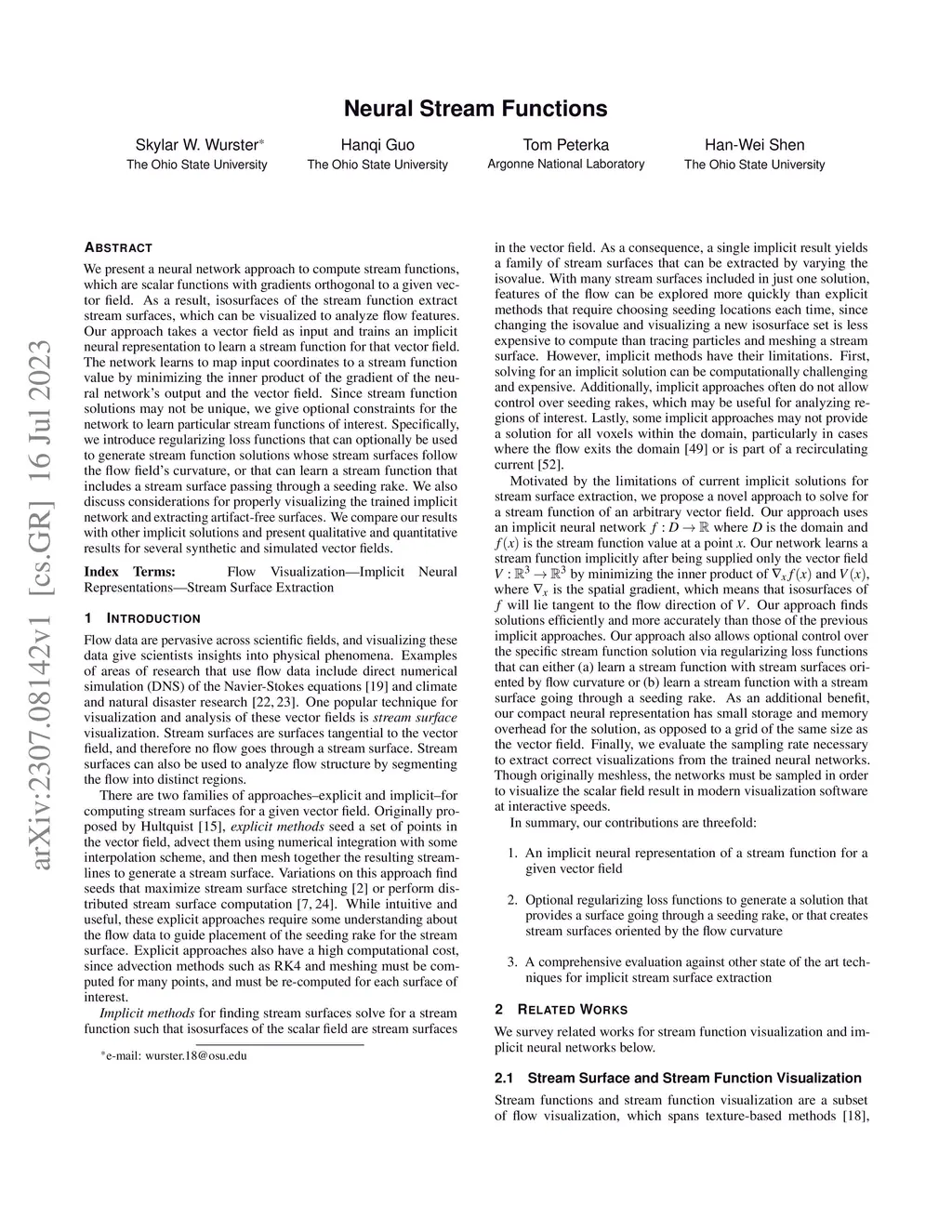 We present a neural network approach to compute stream functions, which are scalar functions with gradients orthogonal to a given vector field. As a result, isosurfaces of the stream function extract stream surfaces, which can be visualized to analyze flow features. Our approach takes a vector field as input and trains an implicit neural representation to learn a stream function for that vector field. The network learns to map input coordinates to a stream function value by minimizing the inner product of the gradient of the neural network's output and the vector field. Since stream function solutions may not be unique, we give optional constraints for the network to learn particular stream functions of interest. Specifically, we introduce regularizing loss functions that can optionally be used to generate stream function solutions whose stream surfaces follow the flow field's curvature, or that can learn a stream function that includes a stream surface passing through a seeding rake. We also discuss considerations for properly visualizing the trained implicit network and extracting artifact-free surfaces. We compare our results with other implicit solutions and present qualitative and quantitative results for several synthetic and simulated vector fields.