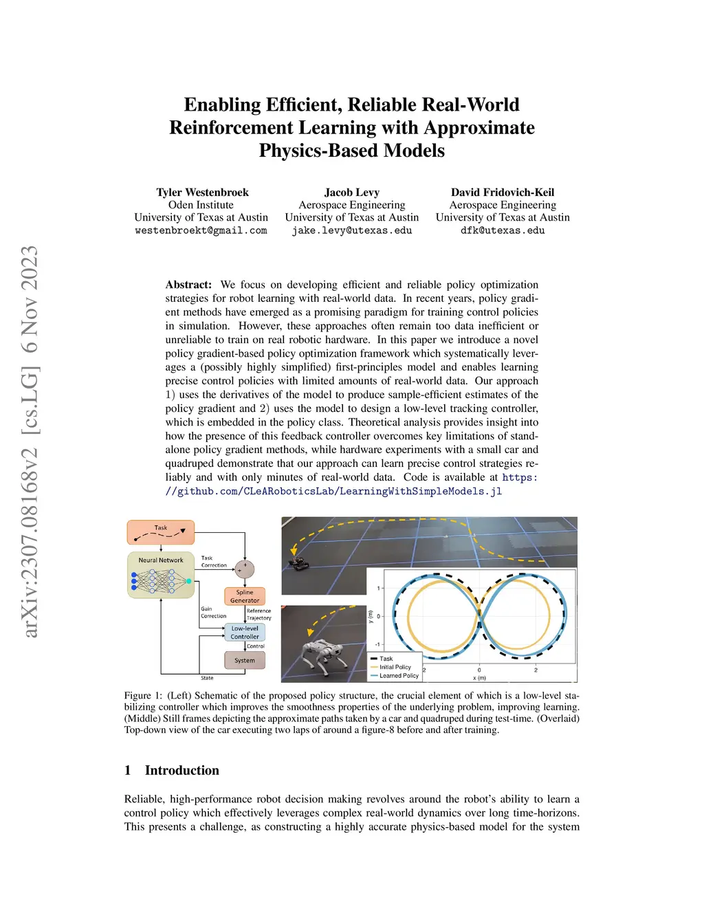 We focus on developing efficient and reliable policy optimization strategies for robot learning with real-world data. In recent years, policy gradient methods have emerged as a promising paradigm for training control policies in simulation. However, these approaches often remain too data inefficient or unreliable to train on real robotic hardware. In this paper we introduce a novel policy gradient-based policy optimization framework which systematically leverages a (possibly highly simplified) first-principles model and enables learning precise control policies with limited amounts of real-world data. Our approach uses the derivatives of the model to produce sample-efficient estimates of the policy gradient and uses the model to design a low-level tracking controller, which is embedded in the policy class. Theoretical analysis provides insight into how the presence of this feedback controller overcomes key limitations of stand-alone policy gradient methods, while hardware experiments with a small car and quadruped demonstrate that our approach can learn precise control strategies reliably and with only minutes of real-world data.