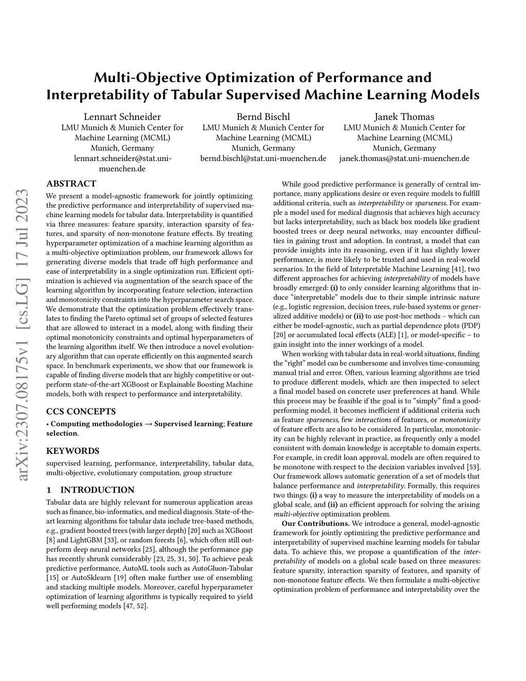 We present a model-agnostic framework for jointly optimizing the predictive performance and interpretability of supervised machine learning models for tabular data. Interpretability is quantified via three measures: feature sparsity, interaction sparsity of features, and sparsity of non-monotone feature effects. By treating hyperparameter optimization of a machine learning algorithm as a multi-objective optimization problem, our framework allows for generating diverse models that trade off high performance and ease of interpretability in a single optimization run. Efficient optimization is achieved via augmentation of the search space of the learning algorithm by incorporating feature selection, interaction and monotonicity constraints into the hyperparameter search space. We demonstrate that the optimization problem effectively translates to finding the Pareto optimal set of groups of selected features that are allowed to interact in a model, along with finding their optimal monotonicity constraints and optimal hyperparameters of the learning algorithm itself. We then introduce a novel evolutionary algorithm that can operate efficiently on this augmented search space. In benchmark experiments, we show that our framework is capable of finding diverse models that are highly competitive or outperform state-of-the-art XGBoost or Explainable Boosting Machine models, both with respect to performance and interpretability.