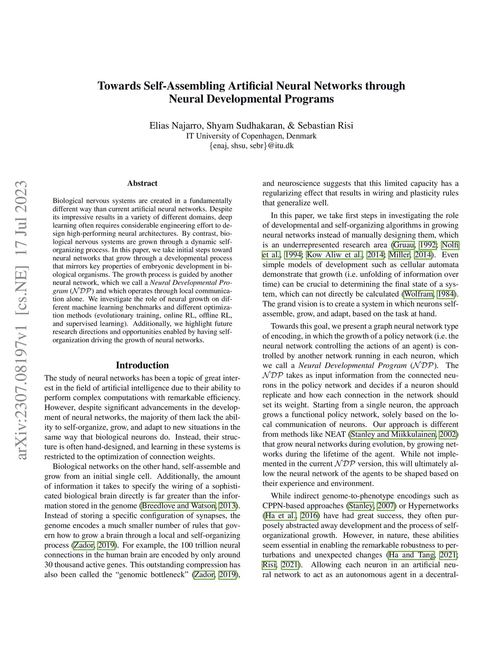 Towards Self-Assembling Artificial Neural Networks through Neural