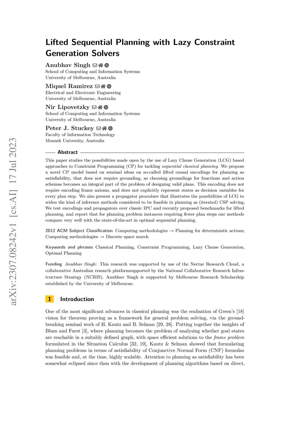 This paper studies the possibilities made open by the use of Lazy Clause Generation (LCG) based approaches to Constraint Programming (CP) for tackling sequential classical planning. We propose a novel CP model based on seminal ideas on so-called lifted causal encodings for planning as satisfiability, that does not require grounding, as choosing groundings for functions and action schemas becomes an integral part of the problem of designing valid plans. This encoding does not require encoding frame axioms, and does not explicitly represent states as decision variables for every plan step. We also present a propagator procedure that illustrates the possibilities of LCG to widen the kind of inference methods considered to be feasible in planning as (iterated) CSP solving. We test encodings and propagators over classic IPC and recently proposed benchmarks for lifted planning, and report that for planning problem instances requiring fewer plan steps our methods compare very well with the state-of-the-art in optimal sequential planning.