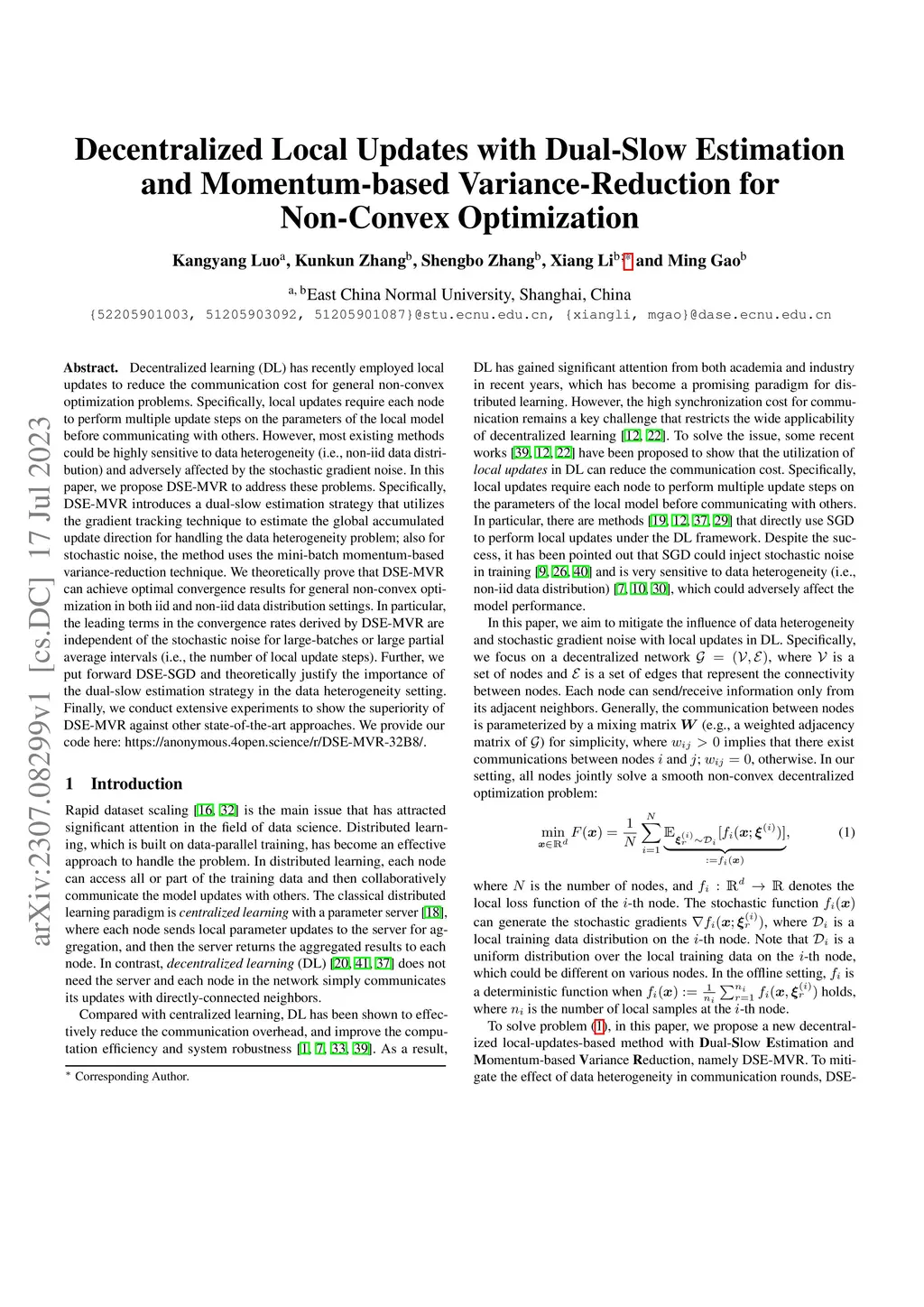 Decentralized learning (DL) has recently employed local updates to reduce the communication cost for general non-convex optimization problems. Specifically, local updates require each node to perform multiple update steps on the parameters of the local model before communicating with others. However, most existing methods could be highly sensitive to data heterogeneity (i.e., non-iid data distribution) and adversely affected by the stochastic gradient noise. In this paper, we propose DSE-MVR to address these problems.Specifically, DSE-MVR introduces a dual-slow estimation strategy that utilizes the gradient tracking technique to estimate the global accumulated update direction for handling the data heterogeneity problem; also for stochastic noise, the method uses the mini-batch momentum-based variance-reduction technique.We theoretically prove that DSE-MVR can achieve optimal convergence results for general non-convex optimization in both iid and non-iid data distribution settings. In particular, the leading terms in the convergence rates derived by DSE-MVR are independent of the stochastic noise for large-batches or large partial average intervals (i.e., the number of local update steps). Further, we put forward DSE-SGD and theoretically justify the importance of the dual-slow estimation strategy in the data heterogeneity setting. Finally, we conduct extensive experiments to show the superiority of DSE-MVR against other state-of-the-art approaches.