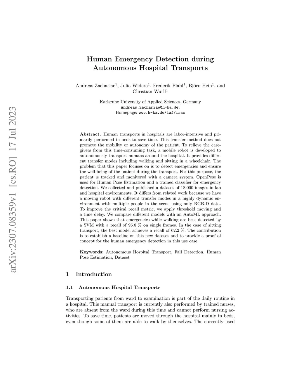 Human transports in hospitals are labor-intensive and primarily performed in beds to save time. This transfer method does not promote the mobility or autonomy of the patient. To relieve the caregivers from this time-consuming task, a mobile robot is developed to autonomously transport humans around the hospital. It provides different transfer modes including walking and sitting in a wheelchair. The problem that this paper focuses on is to detect emergencies and ensure the well-being of the patient during the transport. For this purpose, the patient is tracked and monitored with a camera system. OpenPose is used for Human Pose Estimation and a trained classifier for emergency detection. We collected and published a dataset of 18,000 images in lab and hospital environments. It differs from related work because we have a moving robot with different transfer modes in a highly dynamic environment with multiple people in the scene using only RGB-D data. To improve the critical recall metric, we apply threshold moving and a time delay. We compare different models with an AutoML approach. This paper shows that emergencies while walking are best detected by a SVM with a recall of 95.8% on single frames. In the case of sitting transport, the best model achieves a recall of 62.2%. The contribution is to establish a baseline on this new dataset and to provide a proof of concept for the human emergency detection in this use case.